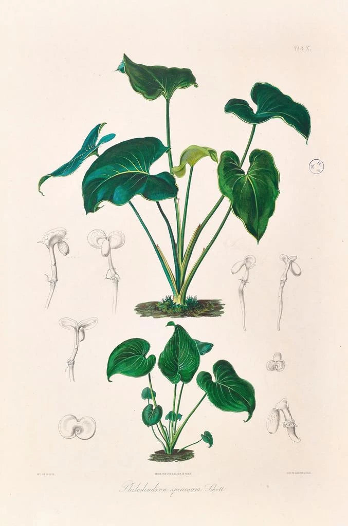 Heinrich Wilhelm Schott, botanico e illustratore del XIX secolo, è riconosciuto per i suoi contributi significativi alla documentazione delle piante tropicali. Il suo lavoro si inserisce nel movimento dell'illustrazione botanica, che mira a unire scienza e arte. Influenzato dalle esplorazioni botaniche della sua epoca, Schott è riuscito a catturare la bellezza delle aroidi con una precisione scientifica. Le sue opere, tra cui "Icones Aroidearum Pl10", sono non solo testimonianze del suo talento artistico, ma anche riferimenti preziosi per i botanici. Attraverso le sue illustrazioni, ha permesso di comprendere meglio la diversità delle specie vegetali.