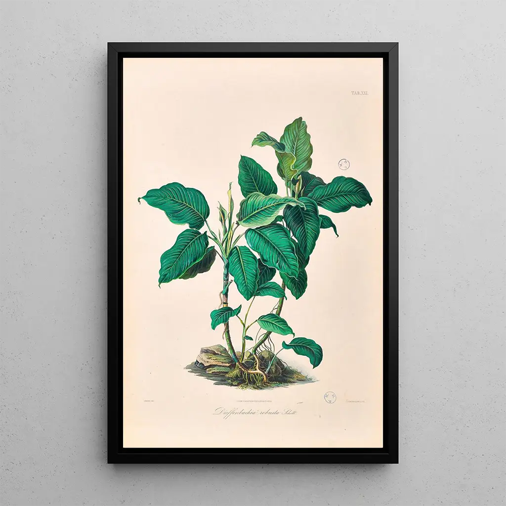 L'œuvre "Icones Aroidearum Pl21" di Heinrich Wilhelm Schott è una vera ode alla diversità delle piante. Questa illustrazione botanica, realizzata con una precisione notevole, mette in evidenza dettagli minuziosi delle foglie e dei fiori, rivelando la bellezza nascosta della natura. I colori vivaci, che vanno dai verdi profondi alle sfumature delicate di rosa e giallo, creano un'atmosfera vivace e dinamica. La tecnica dell'acquerello, usata con cura, permette di catturare la luce e la texture delle piante, offrendo così un'esperienza visiva immersiva. Ogni elemento di questa tela sembra invitare lo spettatore a immergersi in un mondo di verdeggiante rigoglio.