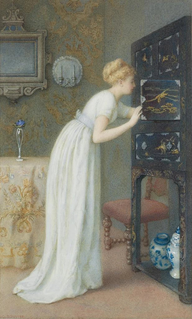 Gustavus Arthur Bouvier, pittore del XIX secolo, ha saputo impregnarsi delle influenze asiatiche per arricchire il proprio stile. Il suo interesse per l'arte orientale lo ha portato a esplorare temi e tecniche che trascendono i confini culturali. In un'epoca in cui l'Occidente iniziava ad aprirsi alle arti asiatiche, Bouvier ha svolto un ruolo chiave integrando questi elementi nel suo lavoro, creando così un dialogo tra due mondi. La sua opera "Le Cabinet laqué" è emblematica di questa fusione, testimonianza del suo talento nel catturare l'essenza dell'arte asiatica pur rimanendo fedele al suo linguaggio artistico.