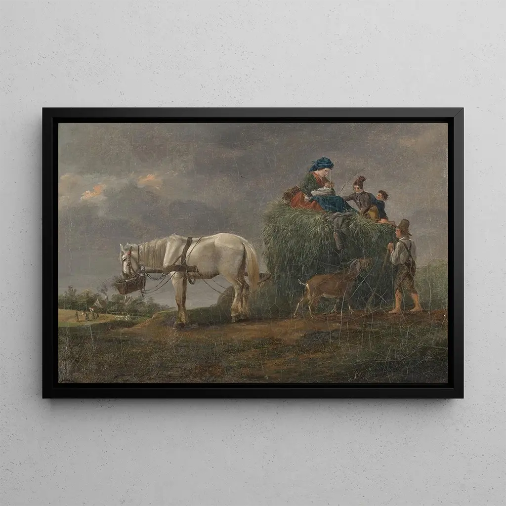 "La charrette de fieno" è una stampa d'arte che cattura l'essenza stessa della vita rurale del XIX secolo. Questo quadro rappresenta una scena vivace in cui contadini si affaccendano intorno a una carrozza carica di fieno, sotto un cielo luminoso. I colori caldi, che vanno dai marroni terrosi ai verdi vivaci, evocano la ricchezza dei paesaggi agricoli. La tecnica di pittura, caratterizzata da dettagli minuziosi e una luce soffusa, crea un'atmosfera vivace e dinamica, invitando lo spettatore a immergersi in questa vita semplice e autentica.