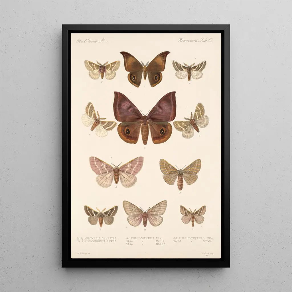 "Insecta Lepidoptera Heterocera Pl 082" di Frederick DuCane Godman è un'opera che immerge lo spettatore nell'universo incantato delle farfalle notturne. Questa stampa d'arte mette in evidenza dettagli di una precisione straordinaria, dove ogni motivo sulle ali è accuratamente riprodotto. I colori caldi e terrosi, mescolati a tocchi di blu e viola, creano un'atmosfera allo stesso tempo misteriosa e affascinante. La tecnica dell'acquarello, usata con raffinatezza, conferisce a ogni insetto una leggerezza quasi eterea, come se fluttuassero nell'aria. Questo quadro è un invito a scoprire la bellezza nascosta della notte.