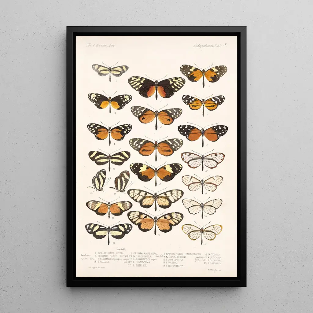 "Insecta Lepidoptera Rhopalocera Pl 003" di Frederick DuCane Godman è un'opera affascinante che celebra la diversità delle farfalle. Questa stampa d'arte offre una rappresentazione vibrante di questi insetti affascinanti, dove ogni dettaglio è accuratamente riprodotto. I colori vivaci, che vanno dalle tonalità pastello a quelle più scure, creano un contrasto sorprendente che cattura l'occhio. La tecnica dell'acquerello permette di catturare la leggerezza delle ali, dando l'impressione che queste farfalle possano volare via in qualsiasi momento. L'atmosfera che emana questa tela è allo stesso tempo serena e dinamica, invitando all'ammirazione.