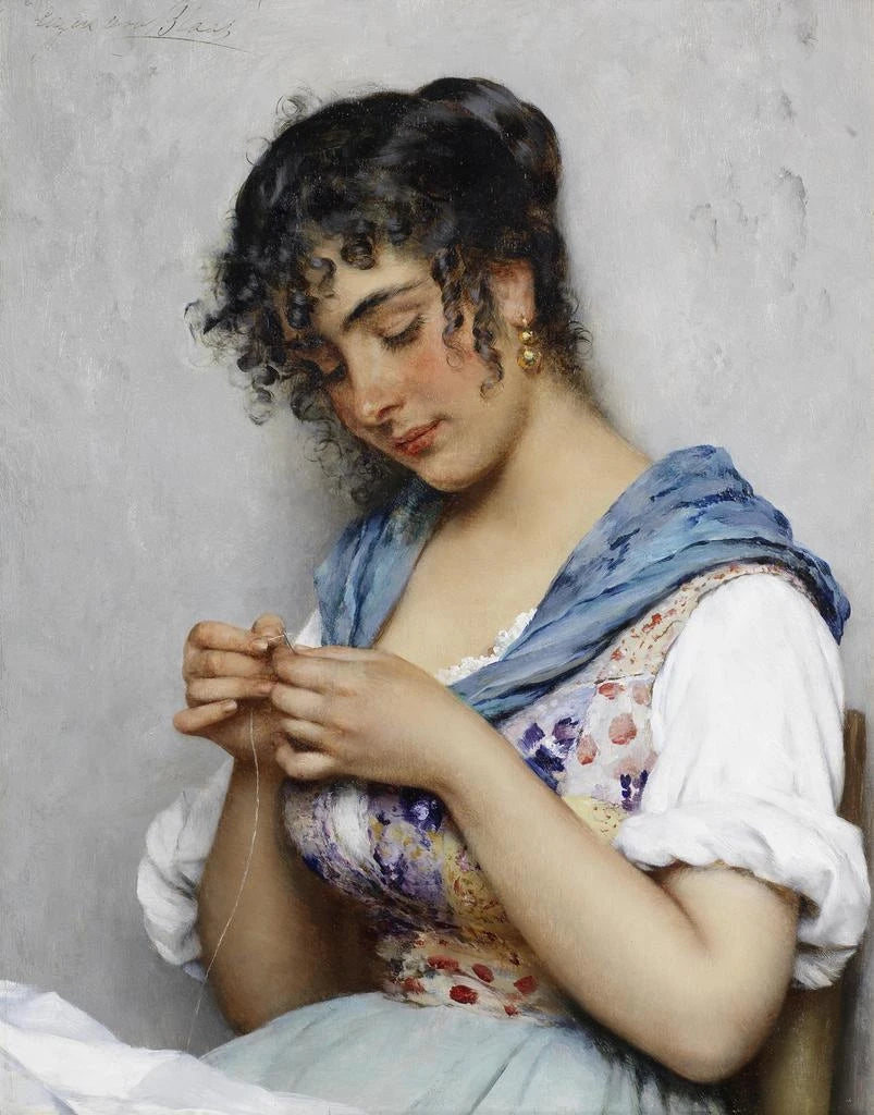 Eugen von Blaas, nato nel 1843 a Venezia, è un rappresentante eminente del movimento accademico e un maestro della pittura di genere. La sua formazione artistica lo ha portato a esplorare vari soggetti, ma sono spesso la vita quotidiana e le donne del suo tempo a ispirarlo di più. L'influenza della cultura italiana è onnipresente nel suo lavoro, e "La sarta italiana" ne è un esempio perfetto. Blaas è riuscito a catturare non solo