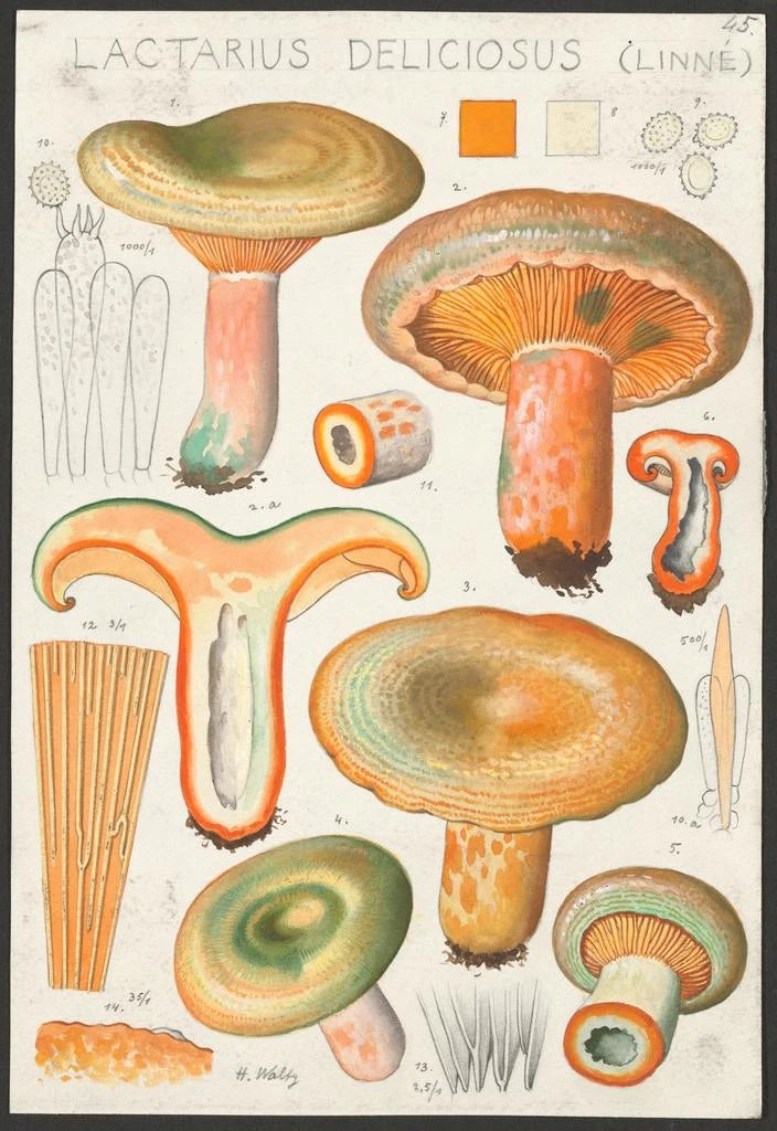 La tavola 'Lactaire delicioso Linn' di Hans Baldung è una vera celebrazione della natura. Con i suoi colori vivaci e le sue forme organiche, quest'opera attira immediatamente lo sguardo. Le sfumature di verde, marrone e ocra si intrecciano per creare una rappresentazione vivida dei funghi, evocando sia la loro bellezza che il loro mistero. La tecnica di Baldung, che mescola realismo e stilizzazione, permette di percepire la texture e la profondità di ogni elemento. Questa tavola è un invito a esplorare le meraviglie della natura, dove ogni dettaglio sembra vibrar di una vita propria.