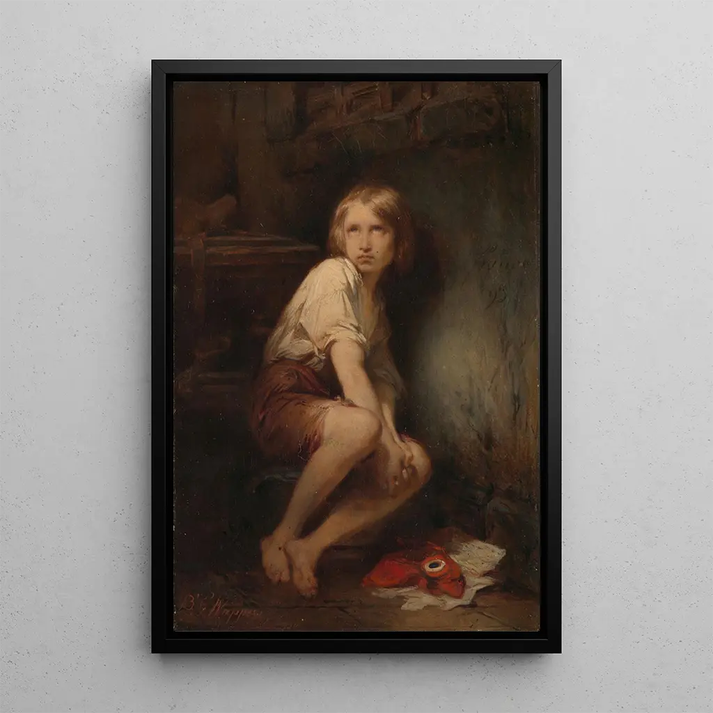 La stampa d'arte di Louis XVII au temple, realizzata da Gustaf Wappers, ci immerge in una scena carica di emozione e malinconia. La tela raffigura il giovane re, rinchiuso nella torre del tempio, con una palette di colori scuri che sottolinea la tristezza del suo destino. I dettagli minuziosi del volto del bambino, intriso di innocenza, contrastano con l'ambiente austero che lo circonda. La tecnica di Wappers, combinando realismo e romanticismo, crea un'atmosfera toccante, dove ogni elemento narra la tragica storia di un bambino re, simbolo di un destino spezzato.