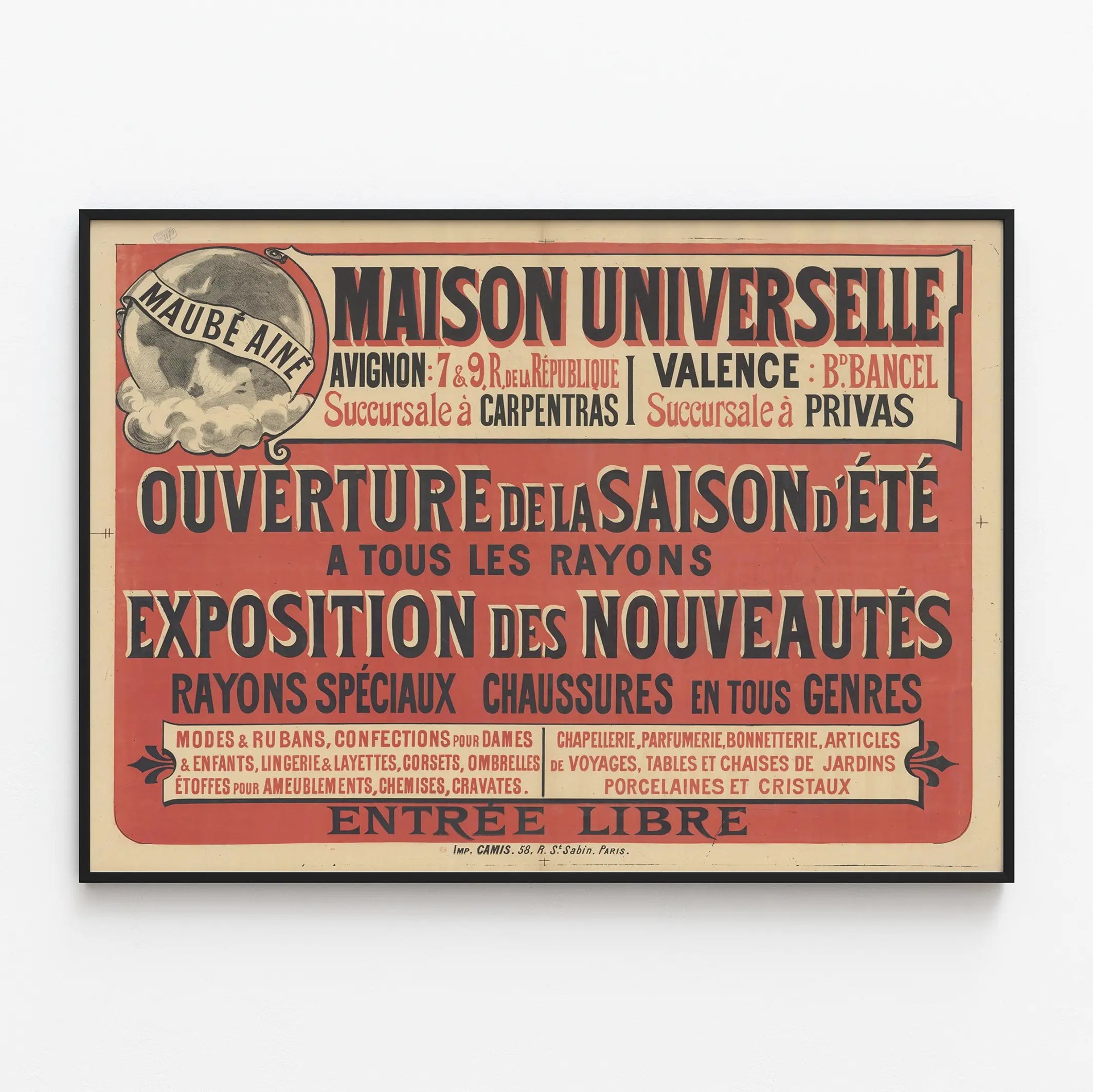 Découvrez cette affiche vintage originale intitulée "Maison Universelle Maube Aîné", un élément unique pour votre décoration murale. Elle met en avant l'ouverture de la saison d'été avec une exposition de nouveautés à tous les rayons. Cette affiche publicitaire ancienne, imprimée avec un fond dominé par des teintes rouge et crème, présente un design typographique puissant et contrasté, idéal pour apporter une touche rétro authentique à votre intérieur. Le poster met en valeur différentes succursales situées à Avignon, Carpentras, Valence et Privas, avec des informations commerciales centrées sur des rayons spécialisés comme les chaussures, les modes et rubans, les confections pour dames et enfants, la lingerie, corsets, ombrelles, ainsi que les articles pour ameublements, chemises, cravates, chapellerie, parfumerie, bonneterie, et bien plus. Ce tableau affiche aussi les objets de la maison et de décoration comme les tables et chaises de jardin en porcelaine et cristal, soulignant ainsi la diversité de l'offre. Son style graphique ancien avec jeux d'ombres dans les lettres rappelle l'époque où les affiches étaient un medium de communication populaire, parfaite pour une ambiance vintage ou industrielle. Cette affiche est un choix décoratif idéal pour les amateurs d'histoire, d'affiches publicitaires anciennes et de décoration murale authentique. Imprimez-la et mettez en valeur vos murs avec ce morceau d'histoire urbaine, alliant charme et élégance d'antan.