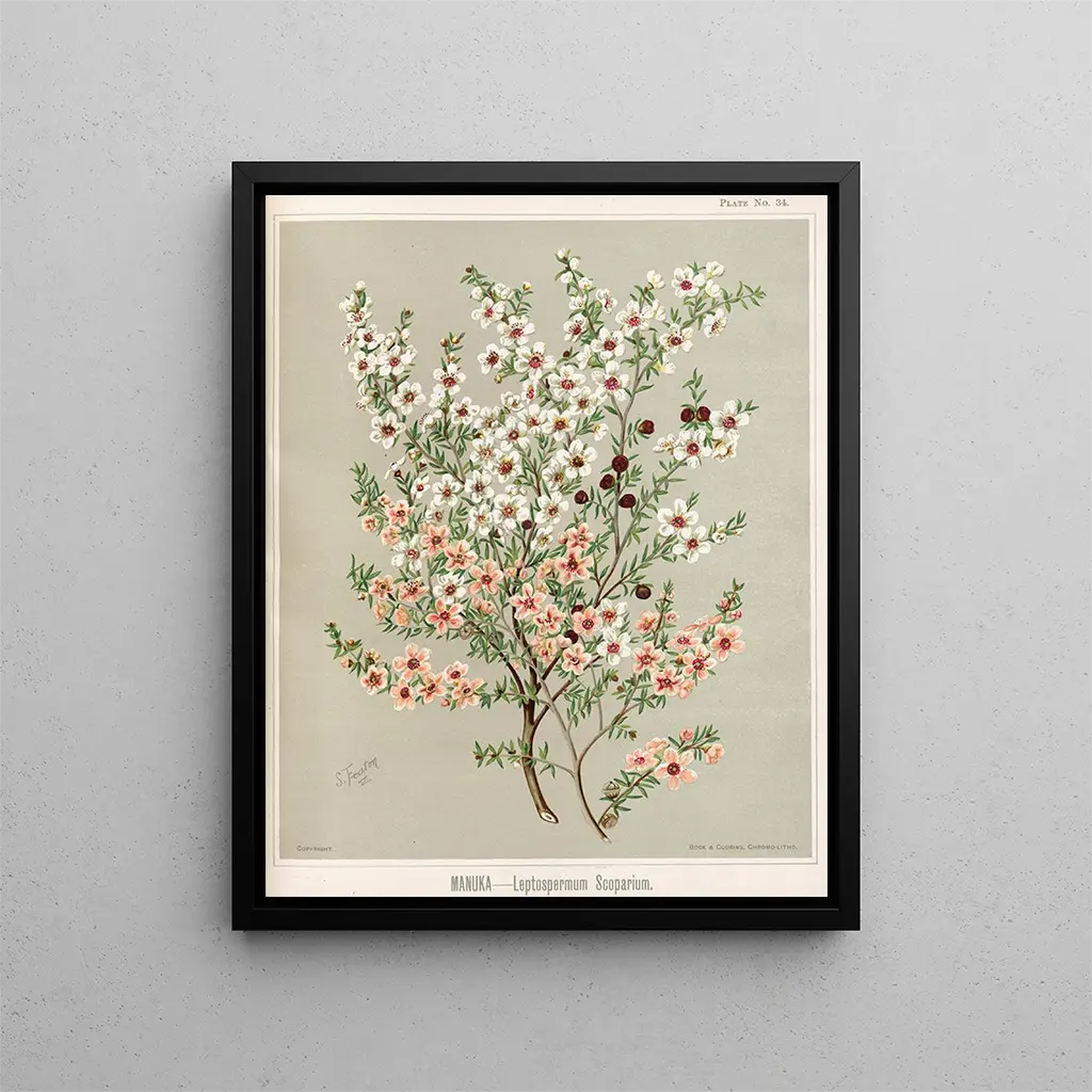Nel 'Manuka Leptospermum scoparium', Sarah Featon illustra con maestria questa pianta, ampiamente riconosciuta per le sue proprietà medicinali e la sua importanza nella cultura māori. Featon, in qualità di artista botanico del XIX secolo, ha saputo unire precisione scientifica e sensibilità artistica, creando opere che vanno oltre la semplice illustrazione. La bellezza del manuka, con i suoi fiori delicati e le sue foglie aromatiche, è catturata con una meticolosità che attira l'occhio e stimola l'immaginazione. Questo quadro non è solo una celebrazione della biodiversità neozelandese, ma anche un invito a esplorare i legami tra natura e cultura. In un contesto contemporaneo, questa opera può portare un tocco di autenticità e di calma. La stampa d'arte di questa illustrazione è da scoprire su Artem Legrand.