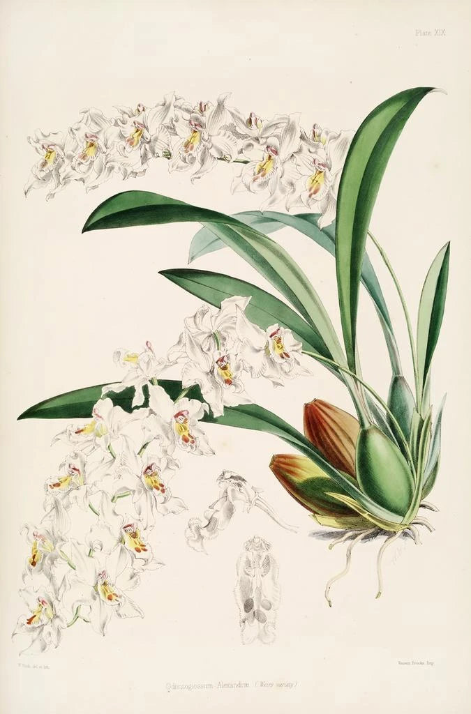 L'œuvre "Una monografia di Odontoglossum Pl18" di James Bateman è una vera ode allo splendore delle orchidee. Questo quadro, ricco di dettagli, presenta una composizione armoniosa in cui ogni fiore è valorizzato da colori vivaci e sfumature delicate. La tecnica dell'acquarello permette di catturare la leggerezza e la trasparenza dei petali, creando un'atmosfera quasi eterea. Le ombre sottili e i giochi di luce aggiungono una dimensione ulteriore, invitando lo spettatore a immergersi in questo affascinante universo floreale.