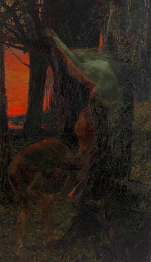 Dans "Mort de la dryade", Max Kurzweil nous plonge dans un univers où la nature et l'émotion s'entrelacent. La composition est dominée par des teintes terreuses et des nuances de vert, évoquant la forêt et la vie végétale. La technique de l'artiste, mêlant le symbolisme et l'impressionnisme, crée une atmosphère à la fois sereine et tragique. Les formes organiques des arbres et des figures humaines se fondent dans un paysage onirique, invitant le spectateur à explorer les profondeurs de la mélancolie et de la beauté éphémère de la vie. Chaque détail de cette toile raconte une histoire, une connexion entre l'homme et la nature, où la dryade, symbole de la vie, semble s'éteindre lentement.