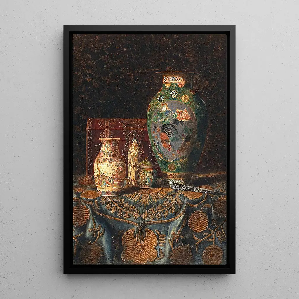 La stampa d'arte de Nature morte avec objets décoratifs asiatiques nous transporte dans un monde de sérénité et d'esthétique raffinée. Max Schedl, à travers cette œuvre, joue avec les textures et les nuances pour créer une composition équilibrée où chaque élément trouve sa place. Les objets asiatiques, soigneusement disposés, sont mis en valeur par un éclairage subtil qui accentue les détails et les couleurs vives. Cette toile invite à la contemplation, révélant la beauté des objets du quotidien et leur capacité à raconter des histoires à travers leur présence.
