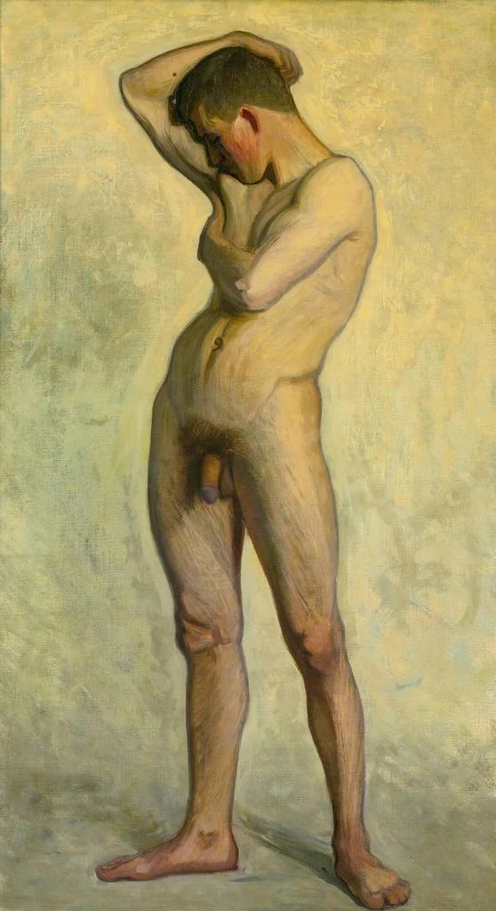 In questa opera affascinante, Eugène Jansson ci immerge nell'intimità del corpo maschile, rivelando una bellezza allo stesso tempo grezza e delicata. Le curve e le linee del modello sono valorizzate da giochi di luce sottili, creando un'atmosfera al contempo sensuale e contemplativa. I colori, principalmente toni caldi e terrosi, apportano una profondità emotiva alla tela, mentre la tecnica di Jansson, che mescola impressionismo e realismo, dà vita alla scena. Questo quadro, per la sua espressività, invita lo spettatore a una riflessione sulla vulnerabilità e sulla forza intrinseche alla condizione umana.