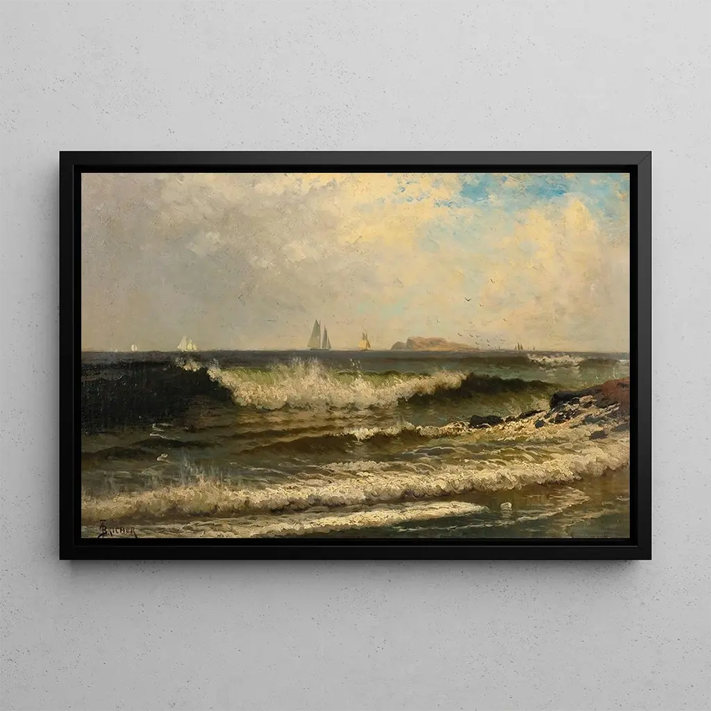 Dans cette œuvre captivante, Alfred Thompson Bricher nous plonge au cœur d'une mer tumultueuse, où les vagues déferlantes s'élèvent avec puissance. Les nuances de bleu et de blanc se mêlent harmonieusement, créant une atmosphère à la fois dramatique et sereine. La technique du peintre, qui allie réalisme et impressionnisme, donne vie à chaque goutte d'eau, chaque éclat de lumière. L'œuvre invite à la contemplation, évoquant la force de la nature et la beauté sauvage des océans.
