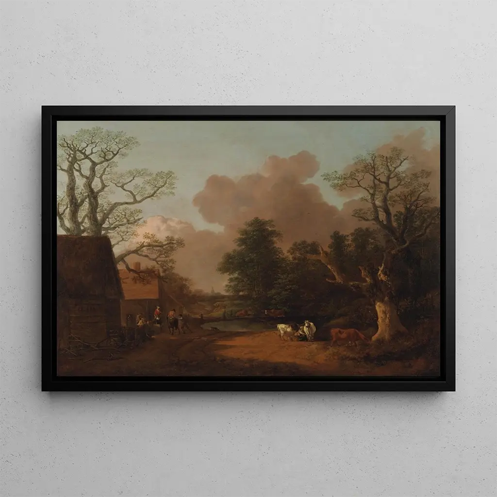 Dans "Paysage avec une Laitière", Thomas Gainsborough nous transporte au cœur d’un paysage pastoral idyllique. La toile dépeint une laitière occupée à ses tâches quotidiennes, entourée de verdure luxuriante et d’une lumière douce qui caresse les formes. Les couleurs délicates et les détails minutieux révèlent une maîtrise exceptionnelle de la technique picturale, créant une atmosphère sereine et nostalgique. Cette œuvre est un hommage à la vie rurale, où chaque élément, du ciel aux arbres, participe à une harmonie visuelle qui invite à la rêverie.