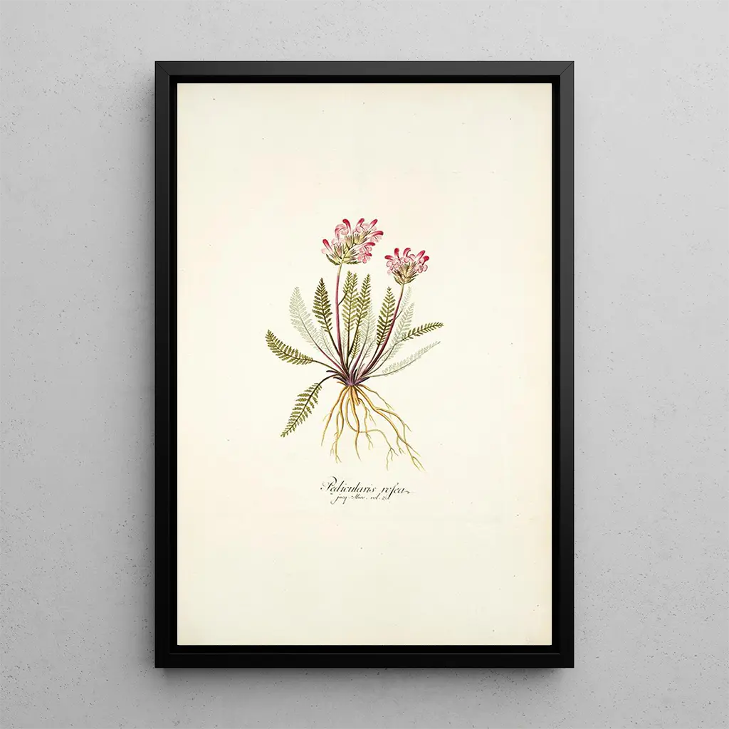 La stampa d'arte di Pedicularis rosea ci immerge in un universo floreale dove la delicatezza dei petali si mescola a una palette di tonalità morbide. Le sfumature di rosa, di verde e di bianco si intrecciano con grazia, creando un'atmosfera rilassante e contemplativa. La tecnica dell'artista, che unisce precisione botanica e sensibilità artistica, permette di percepire la leggerezza di questa pianta. Ogni dettaglio è accuratamente riprodotto, dalle nervature delle foglie alle curve dei fiori, invitando a un'osservazione attenta e a un apprezzamento della bellezza naturale.