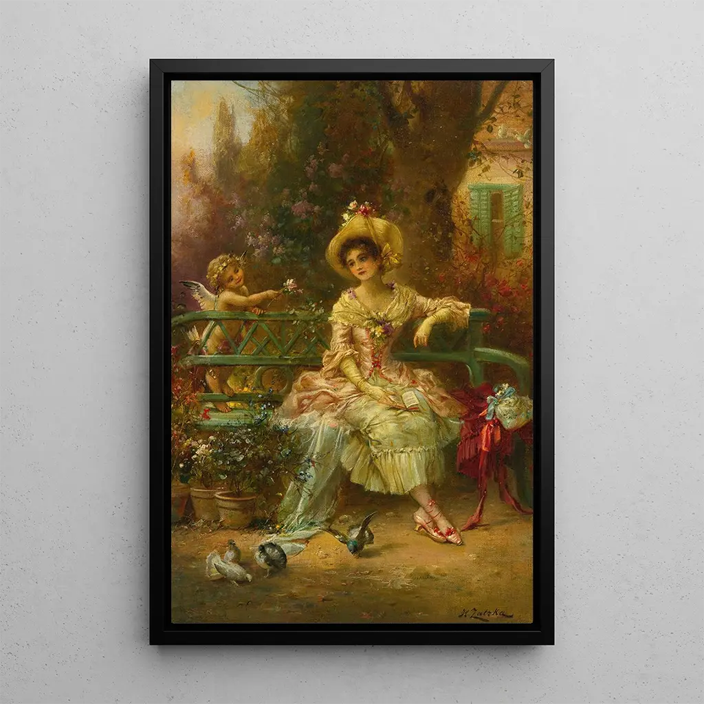 Pensando a lui di Hans Zatzka è un'opera che evoca una profonda introspezione e una delicata malinconia. La composizione mette in scena una giovane donna, immersa nei suoi pensieri, circondata da un cornice floreale rigogliosa. I colori morbidi e pastello, come le rose e i blu, creano un'atmosfera sognante e nostalgica. La tecnica di Zatzka, con i suoi tocchi di pennello delicati e i dettagli raffinati, conferisce a questa tela un'atmosfera intima. Ogni sguardo rivolto a questa stampa d'arte invita a percepire le emozioni della protagonista, facendo di quest'opera un vero specchio dell'anima.