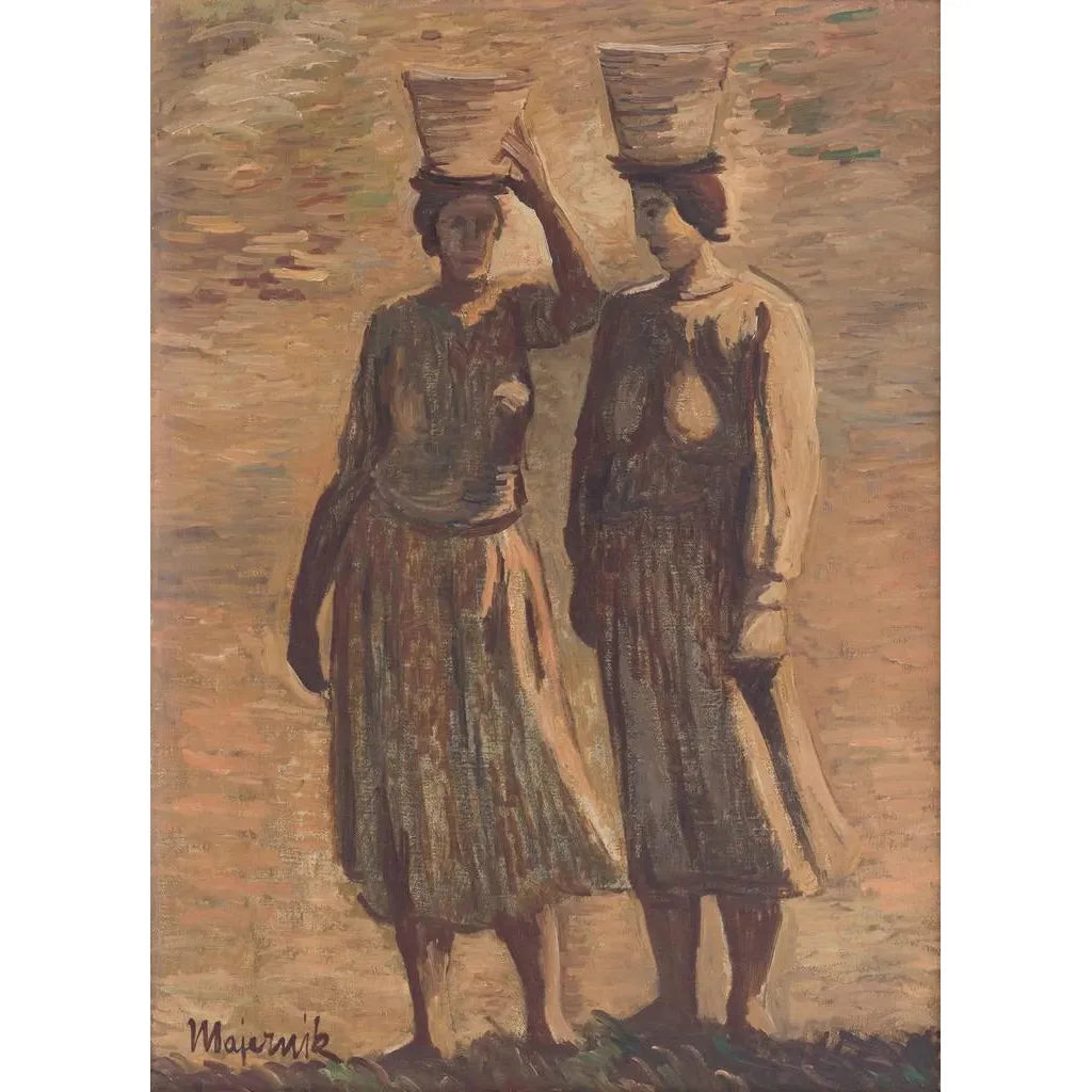 Dans l'œuvre "Porteuses d'eau", Cyprian Majernik capture la beauté et la résilience des femmes qui, à travers les âges, ont été les gardiennes de l'eau, source de vie. Les couleurs chaudes et terreuses de cette toile évoquent une atmosphère de sérénité et de travail acharné. Les figures féminines, représentées avec une délicatesse saisissante, portent des jarres pleines d'eau sur leurs têtes, symbolisant à la fois le fardeau et la grâce. La technique de Majernik, mêlant réalisme et touches impressionnistes, donne vie à cette scène quotidienne, invitant le spectateur à ressentir l'effort et la dignité de ces porteuses d'eau.
