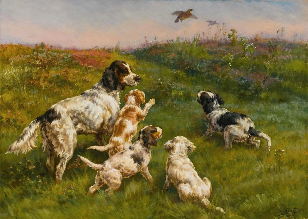 Edmund Henry Osthaus, nato nel 1858, è riconosciuto come uno dei grandi maestri della pittura animale all'inizio del XX secolo. Influenzato dai grandi movimenti artistici della sua epoca, in particolare il realismo e l'impressionismo, ha saputo sviluppare uno stile unico che valorizza la bellezza e l'anima degli animali. Il suo lavoro è spesso caratterizzato da un'attenzione meticolosa ai dettagli e da una profonda comprensione della natura. Osthaus è stato anche un pioniere nella rappresentazione dei cani, il che gli ha valso un riconoscimento duraturo nel mondo dell'arte.