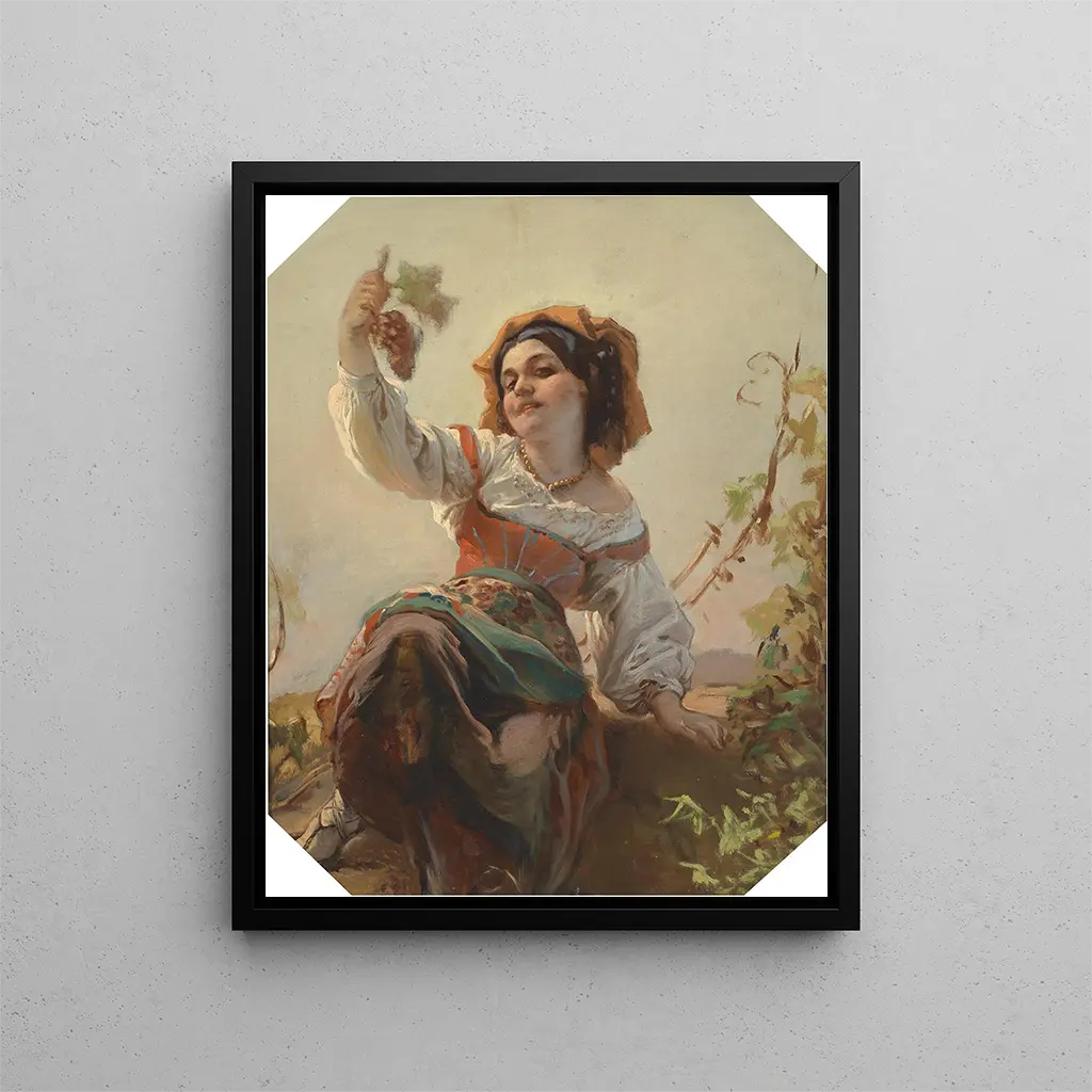 La Reproduction "Fille italienne avec des raisins" de Franz Dobiaschofsky est une pièce maîtresse qui transporte le spectateur dans un univers empreint de sensualité et de charme. La représentation d'une jeune femme, élégamment vêtue, tenant des raisins, évoque une atmosphère de douceur et de volupté. Ce tableau, à la fois simple et riche en symbolisme, est un hommage à la beauté féminine et à la nature. À travers cette œuvre, Dobiaschofsky réussit à capturer un instant suspendu dans le temps, où la grâce et l'innocence se rencontrent. La lumière joue un rôle essentiel dans cette composition, mettant en valeur les traits délicats de la protagoniste et créant un jeu d'ombres et de lumières qui invite à la contemplation.