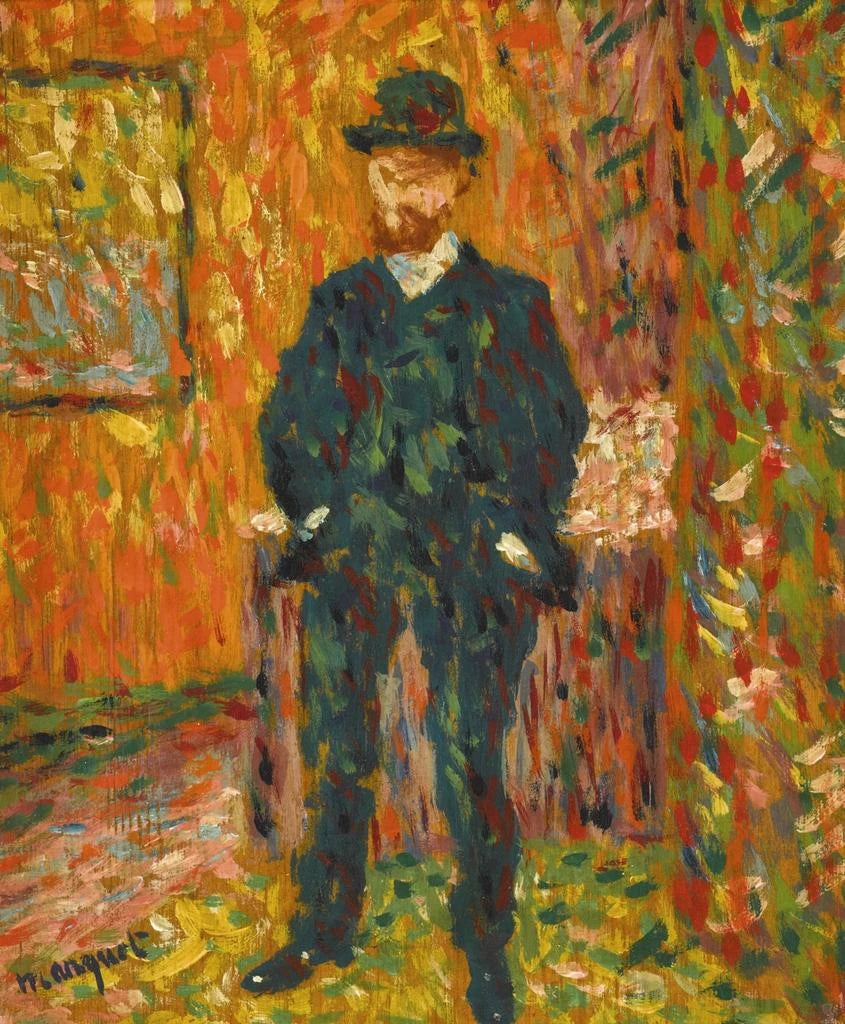 Albert Marquet è spesso considerato uno dei maestri dell'espressionismo fauvista, accanto a figure emblematiche come Henri Matisse e André Derain. La sua carriera, iniziata alla fine del XIX secolo, è segnata da una ricerca incessante di armonia cromatica e di luce. Marquet ha saputo trarre vantaggio dalle influenze impressioniste, forgiano uno stile proprio. La sua amicizia con Rouveyre, anch'egli artista, alimenta una riflessione sull'identità e sull'arte, e questo ritratto ne è la testimonianza vibrante. L'impatto di Marquet sull'arte moderna è indiscutibile, e le sue opere continuano a ispirare numerosi artisti contemporanei che cercano di esplorare i limiti del colore e della forma. Il suo approccio innovativo, combinato a una sensibilità emotiva, lo rende una figura imprescindibile nel panorama artistico del XX secolo.
