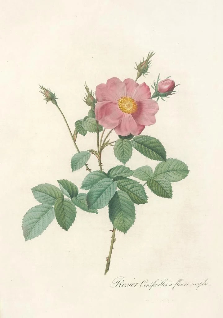 Pierre Joseph Redouté, figura emblematica del XVIII secolo, è riconosciuto per le sue illustrazioni floreali che uniscono arte e scienza. Il suo lavoro è stato influenzato dai giardini reali e ha avuto l'onore di dipingere per la corte di Francia, in particolare per Maria Antonietta. Redouté ha saputo catturare la bellezza dei fiori con tale precisione che è spesso considerato il pioniere dell'illustrazione botanica. "Rosa Centifolia Simplex" è una delle sue opere più rappresentative, testimonianza del suo talento eccezionale e della sua dedizione alla rappresentazione fedele della natura.