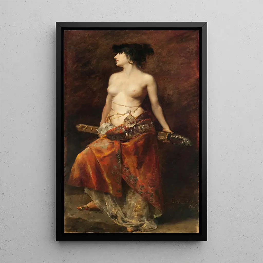 La tela Salomé di Francesc Masriera cattura un momento di tensione drammatica, dove la celebre figura biblica si trova al centro di una scena carica di emozione. I colori ricchi e profondi, come il rosso e l'oro, evocano sia la sensualità che il pericolo. La tecnica di Masriera, mescolando realismo ed elementi simbolisti, crea un'atmosfera incantata, dove ogni dettaglio, dal costume di Salomé all'espressione del suo volto, racconta una storia complessa. Questa stampa d'arte invita a esplorare i temi della seduzione e del potere, offrendo al contempo una visione artistica unica di questo personaggio emblematico.