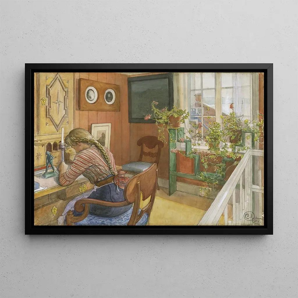 In questa delicata opera, Carl Larsson cattura un momento di tenerezza e riflessione. La composizione mette in evidenza una donna, probabilmente una madre, che scrive lettere, circondata da un interno caldo e luminoso. I colori tenui e pastello, tipici dell’artista, creano un’atmosfera pacifica e intima. La luce naturale che entra dalla finestra evidenzia i dettagli minuziosi dei mobili e degli oggetti, invitando lo spettatore a immergersi in questa scena di vita. Ogni elemento sembra raccontare una storia, e si percepisce quasi il profumo della carta e dell’inchiostro.