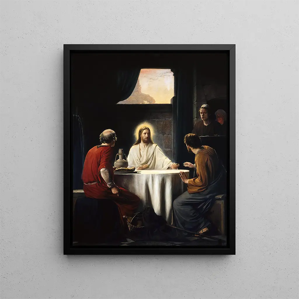 Nel cuore della storia dell’arte, alcune opere si distinguono per la loro capacità di catturare l’essenza stessa dell’umanità. "Souper à Emmaüs - Carl Bloch" è uno di questi capolavori che invita lo spettatore a una riflessione profonda sulla fede, la rivelazione e la comunione. La scena, intrisa di mistero e sacralità, rappresenta un momento chiave della tradizione cristiana: l’incontro dei discepoli con il Cristo risorto. Questo quadro, allo stesso tempo vibrante ed emozionante, trasporta lo sguardo in un’atmosfera carica di emozione, dove ogni dettaglio sembra sussurrare una storia a chi si prende il tempo di immergersi in essa.