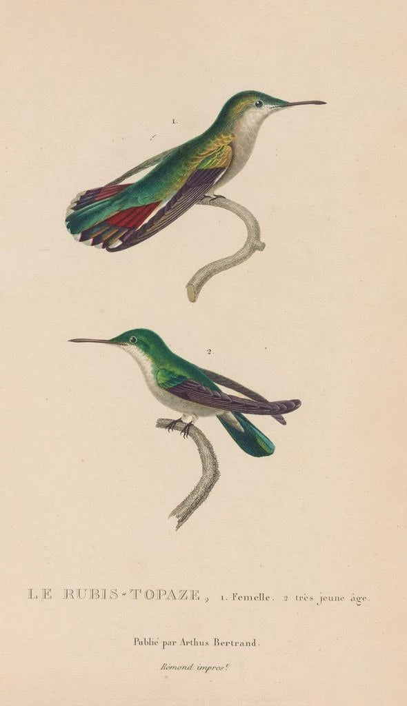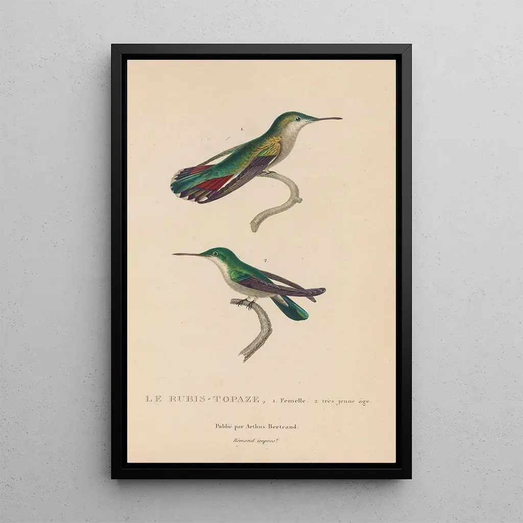 Stampa d'arte Histoire naturelle des oiseaux-mouches Pl54 invita a un viaggio incantato nel cuore della natura. Questa tela, ricca di dettagli, mette in evidenza delicati colibrì sospesi in un balletto aereo. I colori vivaci, che vanno dai verdi brillanti ai rosa delicati, creano un'atmosfera vibrante e gioiosa. La tecnica dell’artista, che combina precisione e fluidità, permette di percepire la leggerezza di queste creature eteree. Ogni piuma è resa con cura, e la composizione generale evoca un'armonia perfetta tra gli uccelli e il loro ambiente floreale.