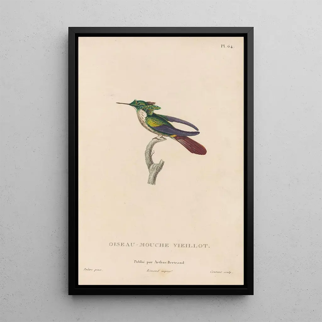 La stampa d'arte Histoire naturelle des oiseaux-mouches Pl65 invite à plonger dans un univers vibrant et délicat. Les oiseaux-mouches, avec leurs plumages éclatants, semblent danser au gré du vent. La composition, soigneusement équilibrée, met en avant des teintes éclatantes de vert, de bleu et de jaune, créant une atmosphère joyeuse et légère. La technique de gravure utilisée par René Primevère Lesson permet de capturer les détails minutieux de ces créatures fascinantes, rendant hommage à leur beauté éphémère. Chaque élément de la toile semble vibrer, comme si les oiseaux prenaient vie sous nos yeux, offrant une véritable ode à la nature.