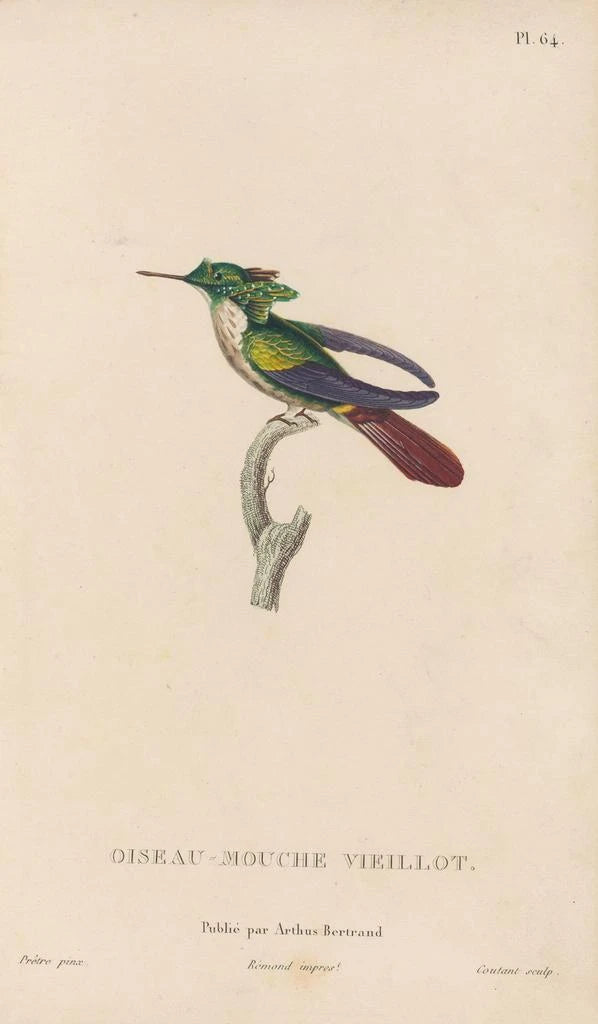 René Primevère Lesson, naturaliste et illustrateur du XIXe siècle, a su marier science et art avec brio. Actif durant une période où l'exploration des espèces était en plein essor, il a été influencé par les découvertes de son temps et par le mouvement romantique qui valorisait la nature. Ses œuvres, notamment dans l'Histoire naturelle des oiseaux-mouches, témoignent de son engagement à représenter fidèlement la faune aviaire. En tant que membre de l'Académie des sciences, Lesson a contribué à l'avancement des connaissances ornithologiques tout en laissant un héritage artistique durable, faisant de lui une figure incontournable de l'illustration naturaliste.