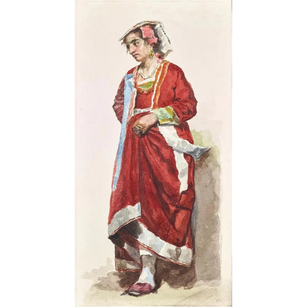 L'opera "Studio di costume femminile Italia centrale" di Albin Stein è una vera finestra sul passato, catturando l'essenza degli abiti tradizionali di questa regione. I dettagli minuziosi dei tessuti, i colori ricchi e i motivi delicati evocano un'atmosfera di raffinatezza e nostalgia. La tecnica dell'artista, combinando acquerello e disegno, permette di rendere la fluidità dei drappeggi e la texture delle stoffe con una precisione notevole. Ogni elemento della composizione sembra raccontare una storia, invitando lo spettatore a immaginare la vita quotidiana delle donne di quell'epoca.