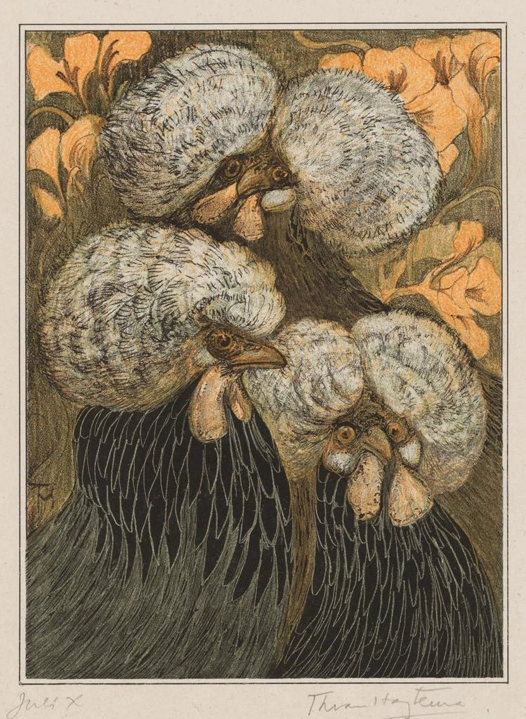 Theo van Hoytema, attivo alla fine del XIX secolo e all'inizio del XX, è un artista olandese il cui lavoro si concentra spesso sulla fauna e sulla flora. Il suo stile, influenzato dall'Art Nouveau, si caratterizza per linee fluide e motivi organici. Hoytema ha saputo affermarsi come un osservatore attento della natura, catturando momenti di vita quotidiana con una sensibilità unica. La sua opera è stata ampiamente riconosciuta e apprezzata, facendolo diventare una figura importante nel mondo dell'arte floreale e animale. La sua capacità di coniugare estetica e naturalismo continua a ispirare molti artisti contemporanei.