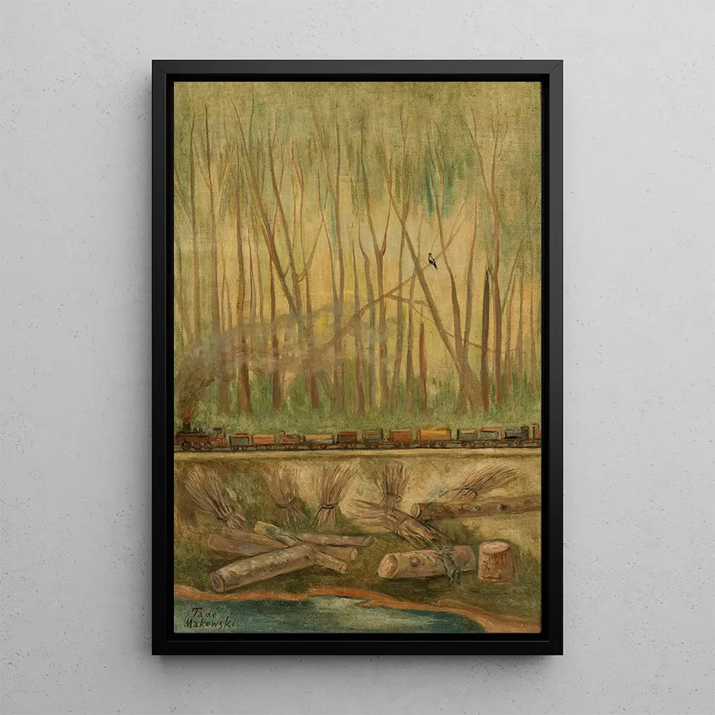 Il quadro "Train" di Tadeusz Makowski evoca un viaggio sia fisico che emotivo. La composizione dinamica, con linee che sembrano estendersi all'infinito, cattura lo sguardo e invita all'evasione. I colori caldi e terrosi, mescolati a tocchi di blu, creano un'atmosfera nostalgica, quasi sognante. La tecnica di Makowski, che unisce realismo ed elementi stilizzati, dà vita a questa scena ferroviaria, dove ogni dettaglio racconta una storia. L'opera sembra catturare il movimento del treno, simbolo di progresso e libertà, evocando al contempo una certa malinconia legata al passare del tempo.