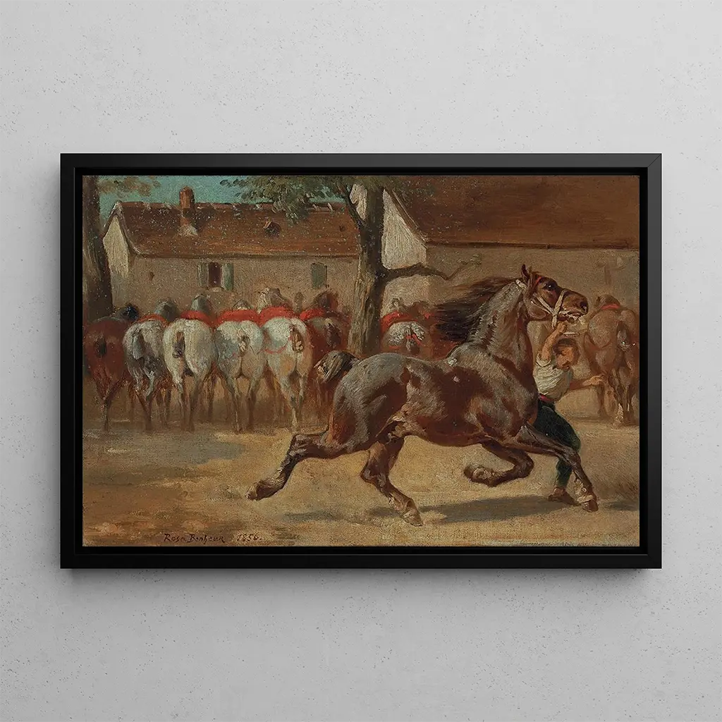 Un cavallo al trotto: un'ode alla potenza equestre La tela "Un cavallo al trotto" di Rosa Bonheur cattura brillantemente la maestà e la grazia del cavallo in movimento. I colori terrosi e le sfumature di marrone si mescolano armoniosamente per creare un'atmosfera vivace e dinamica. La tecnica realistica di Bonheur, caratterizzata da dettagli minuziosi, permette di percepire la forza e l'energia dell'animale. Ogni muscolo, ogni movimento è reso con tale precisione che si potrebbe quasi sentire il rumore degli zoccoli che colpiscono il suolo. Quest'opera invita a una contemplazione profonda, rivelando non solo la bellezza del cavallo, ma anche l'amore che l'artista nutre per la natura. Rosa Bonheur: pioniera della pittura animale Rosa Bonheur, figura emblematica del XIX secolo, è riconosciuta per il suo talento eccezionale nella rappresentazione degli animali. Nata nel 1822, è stata influenzata dal realismo e dal naturalismo, movimenti che promuovono l'osservazione minuziosa della natura. La sua opera si distingue per un approccio quasi scientifico, dove ogni dettaglio è accuratamente osservato e riprodotto. Bonheur ha sfidato le convenzioni del suo tempo, diventando una delle prime donne riconosciute nel mondo dell'arte, e il suo lascito perdura attraverso le sue opere che celebrano la bellezza del regno animale. Una riproduzione decorativa con molteplici vantaggi La riproduzione di "Un cavallo al trotto" è una scelta decorativa ideale per arricchire l'atmosfera del tuo salotto, ufficio o camera da letto. La qualità di stampa garantisce una fedeltà notevole ai colori e ai dettagli dell'opera originale, portando un tocco di eleganza e dinamicità al tuo spazio. Questo quadro cattura lo sguardo e stimola conversazioni, aggiungendo anche un tocco di raffinatezza alla tua decorazione d'interni. Scegliendo questa stampa d'arte, opti per un pezzo che unisce bellezza artistica e fascino senza tempo, perfetto per gli amanti dell'arte e della natura.