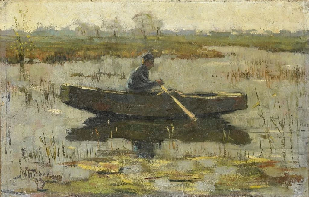 L'opera "Uomo in una barca" di Herman Wolbers evoca una scena serena in cui un uomo, solo sulla sua imbarcazione, sembra fluttuare in un mondo di serenità. Le sfumature di blu e verde si mescolano armoniosamente, creando un'atmosfera rilassante. La tecnica dell'artista, che utilizza pennellate fluide, dà vita all'acqua, mentre il cielo si tinge di tonalità morbide, quasi eteree. Questa stampa d'arte invita alla contemplazione, alla rêverie, e trasporta lo spettatore in un momento sospeso nel tempo, dove la natura e l'uomo coesistono in perfetta armonia.