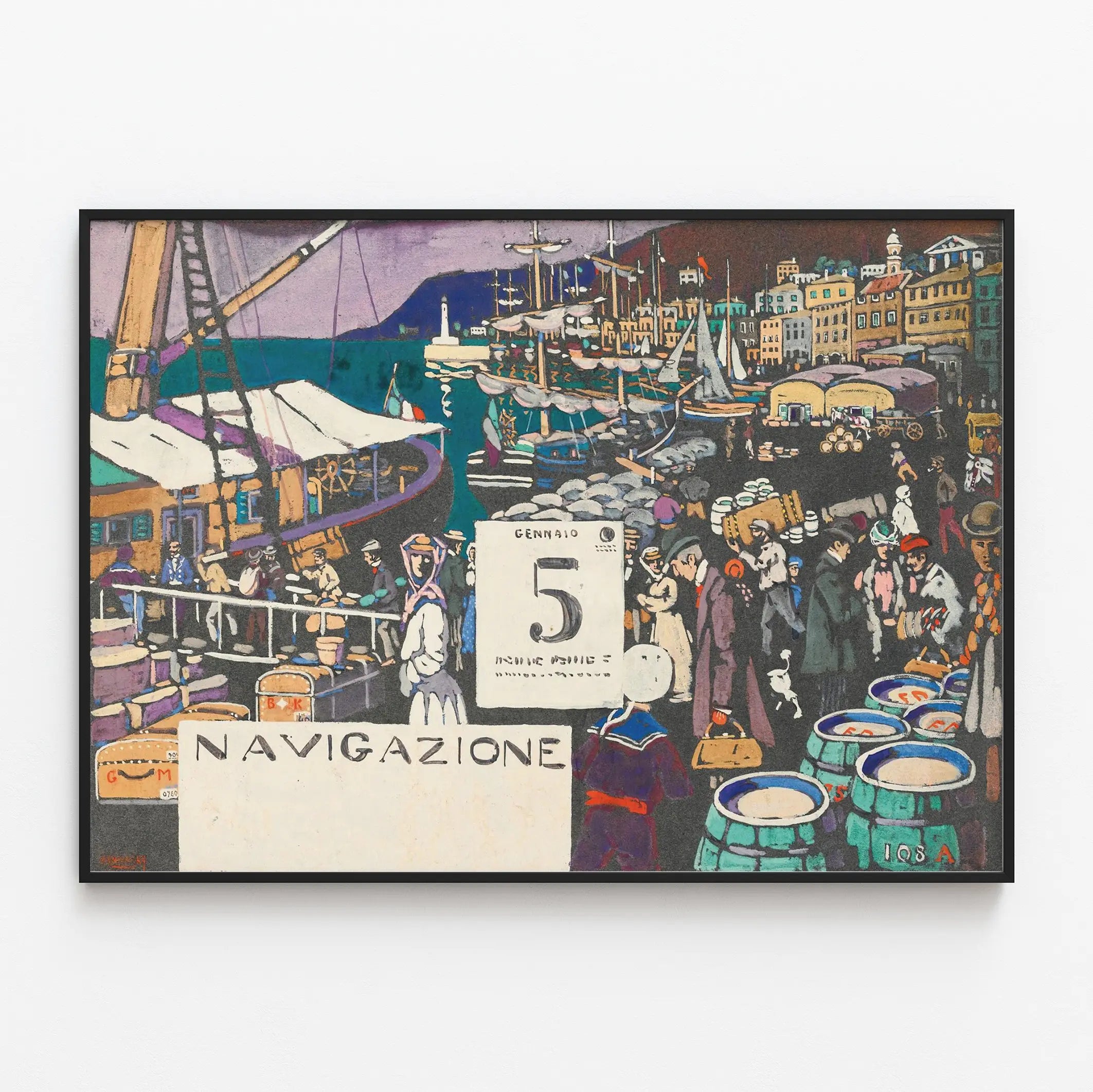 Dieses Vintage-Poster zeigt eine lebendige Szene eines Hafenviertels, perfekt für eine Wanddekoration, die sowohl Eleganz als auch das geschäftige Treiben der Hafenaktivitäten widerspiegelt. Das Poster präsentiert eine detaillierte Ansicht eines Kai, an dem mehrere Segelschiffe vertäut sind, umgeben von zahlreichen Figuren in historischer Kleidung, was Ihrem Interieur einen Hauch von Authentizität und historischem Charme verleiht. Die kräftigen, kontrastreichen Farben dominieren das Bild, mit einer Mischung aus tiefem Blau, Violett und Ockertönen, die die maritime Atmosphäre und die städtische Architektur im Hintergrund betonen. Das Poster hebt Elemente wie die Segel der Boote, Fässer, Passanten sowie einen großen Kalender mit dem Datum 5. Januar hervor, was den Eindruck eines eingefrorenen Moments in der Zeit verstärkt. Ideal für eine Wanddekoration im Wohnzimmer, Büro oder Esszimmer lädt dieses Poster zum Träumen ein und verwandelt Ihren Raum in eine Hommage an das maritime Erbe. Sein künstlerischer Stil, der Präzision und grafische Stylisierung verbindet, macht dieses Poster zu einem originellen Dekorationsstück, das sowohl Liebhaber klassischer Kunst als auch Marine- und Geschichtsbegeisterte anspricht. Bereichern Sie Ihr Zuhause mit einem Hauch von Vintage-Flair durch dieses Hafen-Poster, das auch ein ausgezeichnetes Geschenk für Sammler oder Liebhaber nautischer Szenen und alter Stadtlandschaften ist.