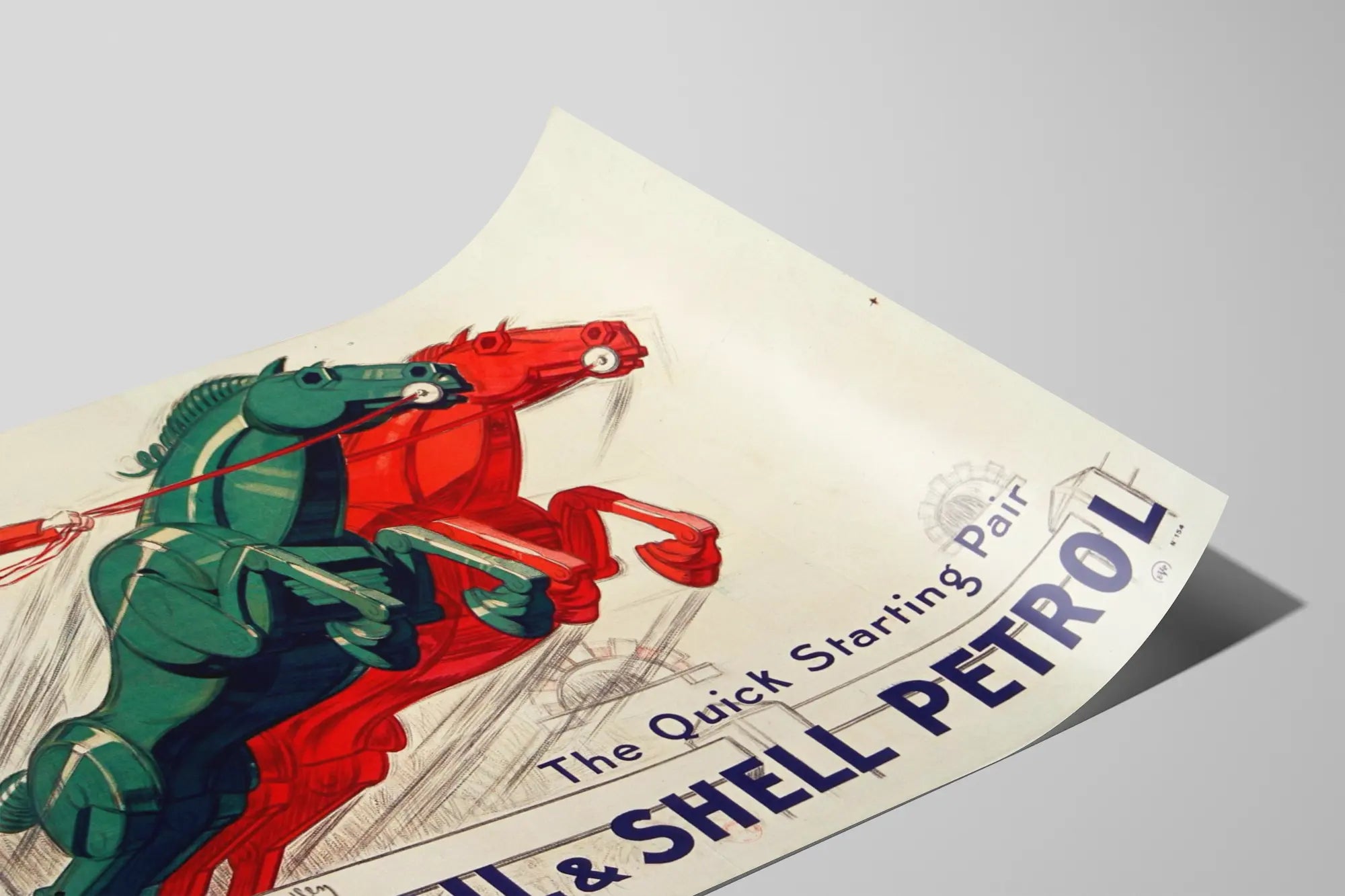 Dieses faszinierende Vintage-Poster zeigt eine originale Illustration von zwei mechanischen Pferden – eines rot, das andere grün – im vollen Lauf, mit einem jungen Jungen in Rot, der energisch die Zügel hält. Mit den Texten "The Quick Starting Pair" und "SHELL OIL & SHELL PETROL" verkörpert diese Wanddekoration den dynamischen und kraftvollen Geist der Shell-Produkte. Dieses Retro-Design-Werbeposter bietet eine einzigartige Ästhetik, die mechanische Kunst und Animation verbindet – perfekt für eine originelle und bewegungsreiche Wandgestaltung. Dieses Poster passt ideal zu einem industriellen oder Vintage-Ambiente, sei es im Wohnzimmer, Büro oder in einem Raum für Automobilenthusiasten. Die Rot- und Grüntöne kontrastieren mit einem hellen Hintergrund und heben die stilisierten geometrischen Formen der Pferde hervor, ein Symbol für Geschwindigkeit und Leistung. Dieses Vintage-Poster von Shell Oil & Shell Petrol ist perfekt für Liebhaber von Retro-Wanddekorationen mit Werbecharme, das alten Charme mit ikonischer Dynamik verbindet. Es ist ein einzigartiges Plakat, das Aufmerksamkeit erregt und gleichzeitig eine Geschichte von Kraft und schnellem Start erzählt, die die Qualität des Öls und Kraftstoffs von Shell widerspiegelt.