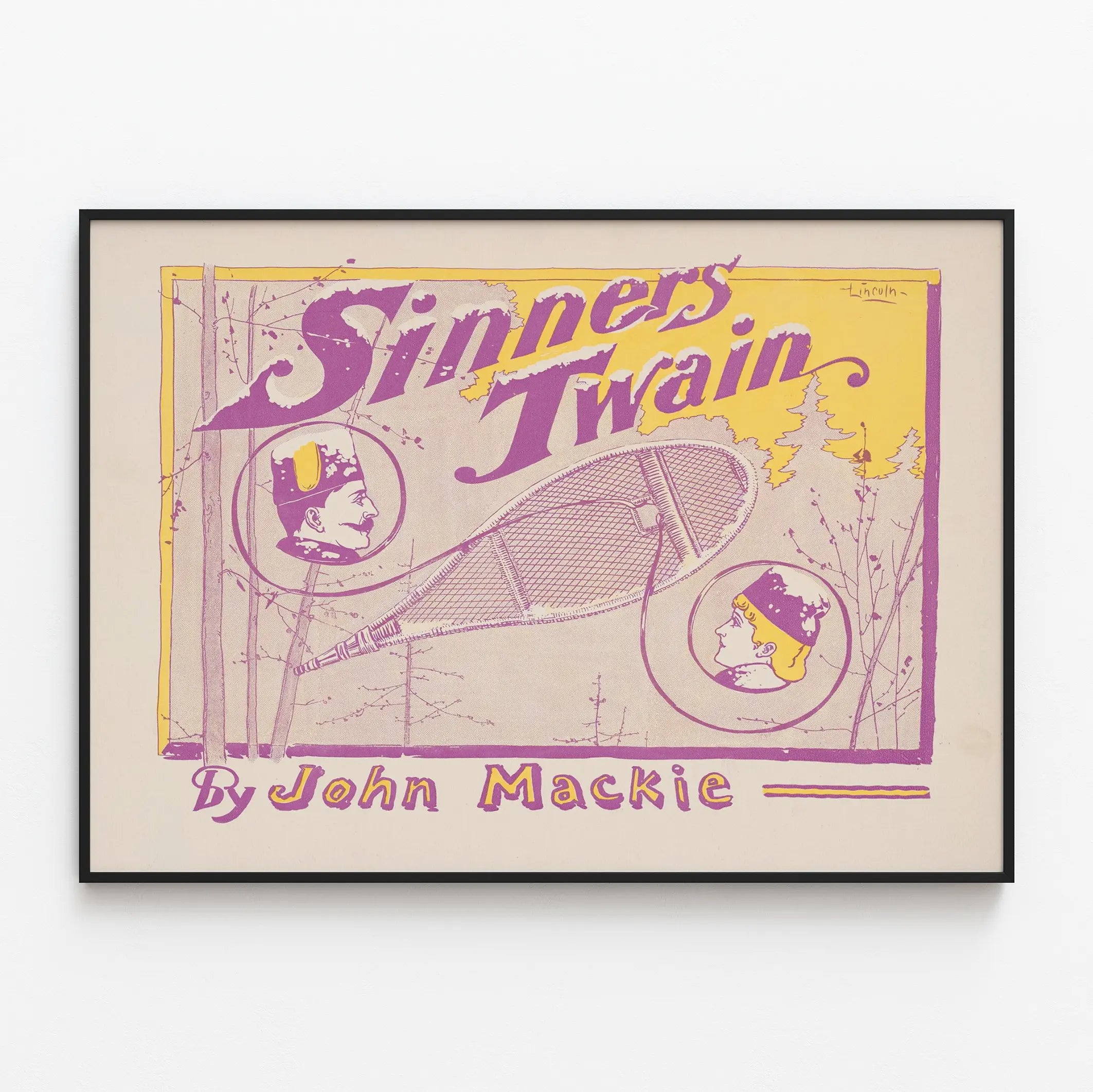 Entdecken Sie dieses Vintage-Poster mit dem Titel „Sinners Twain“, geschaffen von John Mackie, das perfekt ist, um Ihre Wanddekoration mit einem Hauch von Retro und Kunst zu bereichern. Dieses Poster zeigt ein originelles Design in zwei dominanten Farbtönen, Violett und Gelb, die den Blick auf natürliche Weise anziehen. Auf einem detaillierten Hintergrund ist im Zentrum ein Tennisschläger zu sehen, ein kraftvolles Symbol, das eine interessante visuelle Dynamik verleiht. Zwei kreisförmige Porträts im Profil, eines eines bärtigen Mannes mit Fez und das andere einer blondhaarigen Frau, ebenfalls mit Hut, rahmen den Schläger ein und bilden ein harmonisches Gleichgewicht in der Komposition. Der Text „Sinners Twain“ in großzügiger Handschrift nimmt den oberen Bereich des Posters ein und zieht mit seiner intensiven Farbe die Aufmerksamkeit auf sich. Unten betont die Inschrift „By John Mackie“ die Echtheit des Werkes. Dieses Poster ist eine einzigartige Wahl für eine authentische Wanddekoration in einem Ambiente, das eine Vintage-Atmosphäre sucht, sei es im Wohnzimmer, in einer Bibliothek oder im Büro. Ob als gerahmtes Poster oder einfach nur aufgehängt, es verleiht einen Hauch von altem Eleganz und bleibt gleichzeitig ein originelles, grafisches Element. Die warme Farbpalette und der detaillierte Illustrationsstil machen dieses Stück zur perfekten Wahl für Liebhaber grafischer Kunst und begeisterte Sammler thematischer Wanddekorationen. Verleihen Sie Ihren Wänden eine starke visuelle Geschichte mit diesem Poster von John Mackie, das Tradition und Persönlichkeit vereint. Ideal für Räume, die Charakter suchen, wird dieses Druckbild sowohl mit klassischen als auch mit modernen Ambiente harmonieren, dank seines markanten Designs und seines zeitlosen Stils.