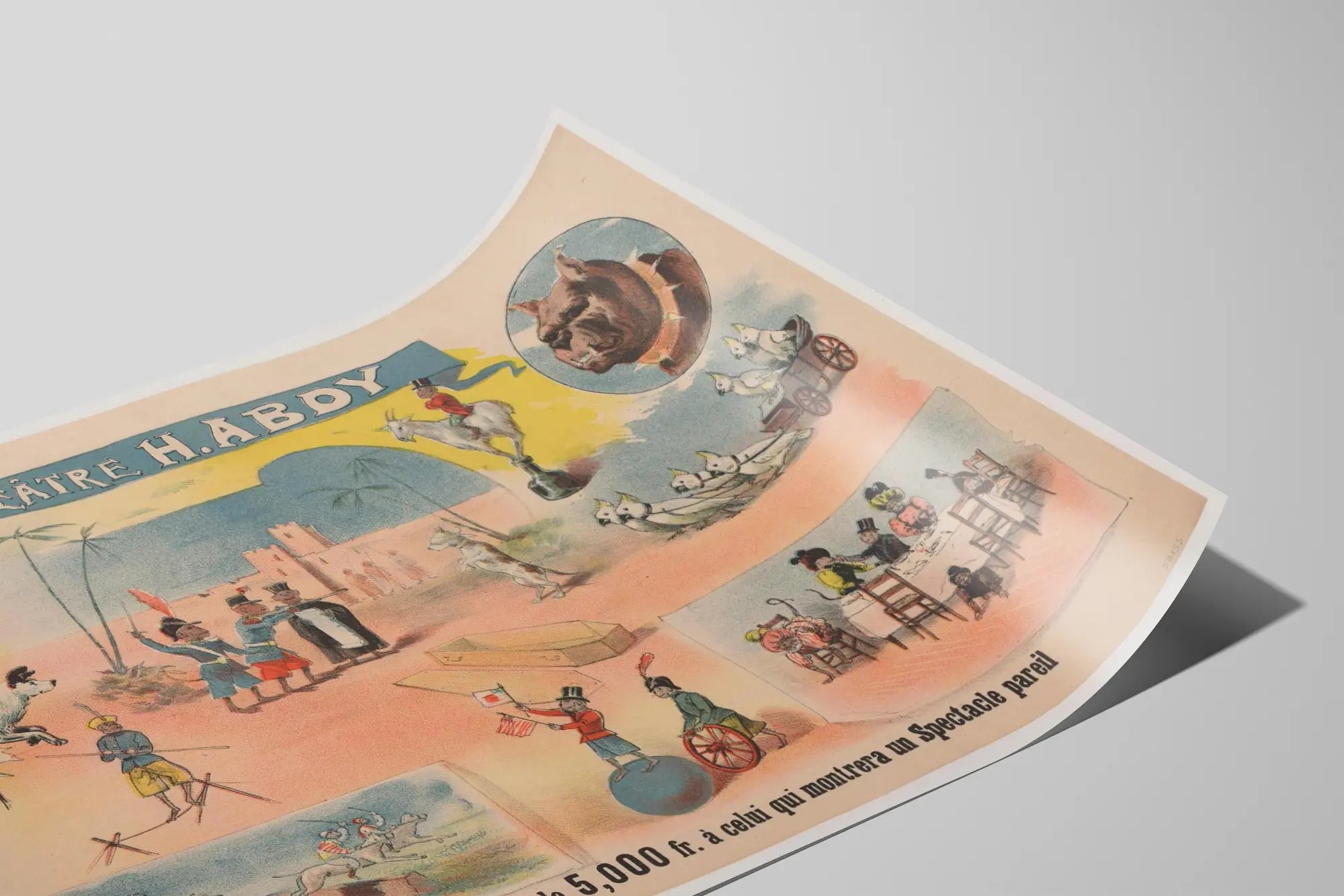 Dieses Vintage-Poster ist ein ikonisches Stück des Theaters H. Abdy und illustriert die Herausforderung, die Professor Abdy gestellt hat: 5.000 Franken für jeden, der eine identische Vorstellung präsentieren kann. Dieses antik wirkende Poster fängt mit Feinfühligkeit und Humor eine Show ein, die gezähmte Tiere und spektakuläre Nummern kombiniert. Man erkennt verschiedene Elemente der Theaterbühne, wie einen Papagei, einen Hund, der durch einen Reifen springt, Schauspieler in historischer Kostümierung, eine Ziege, die von einer kleinen Figur mit Zylinder gesteuert wird, und mehrere Kakadus, die in eine spielerische Inszenierung eingebunden sind. Die farbenfrohe und zarte Atmosphäre dieser Wanddekoration ist perfekt für Liebhaber von Retro-Kunst und Theatergeschichte. Als künstlerisches Poster oder Wandbild verleiht es Ihrer Raumgestaltung eine originelle und authentische Note. Ideal für ein Wohnzimmer, ein Büro oder einen Theatersaal lädt dieses Bild zu einer Zeitreise ein in die faszinierende Welt der Tierdressuren und Theateraufführungen vergangener Tage. Die ausgewogene Komposition hebt die Lebendigkeit der Figuren und Tiere in einer schlichten, aber ausdrucksstarken Kulisse hervor. Dieses Druckbild ist ein schönes Beispiel für Theater-Lithografien, die verwendet wurden, um einzigartige Aufführungen anzukündigen und zu feiern, und verschönert Ihre Wände stilvoll mit einer Atmosphäre voller Geschichte und Kreativität.