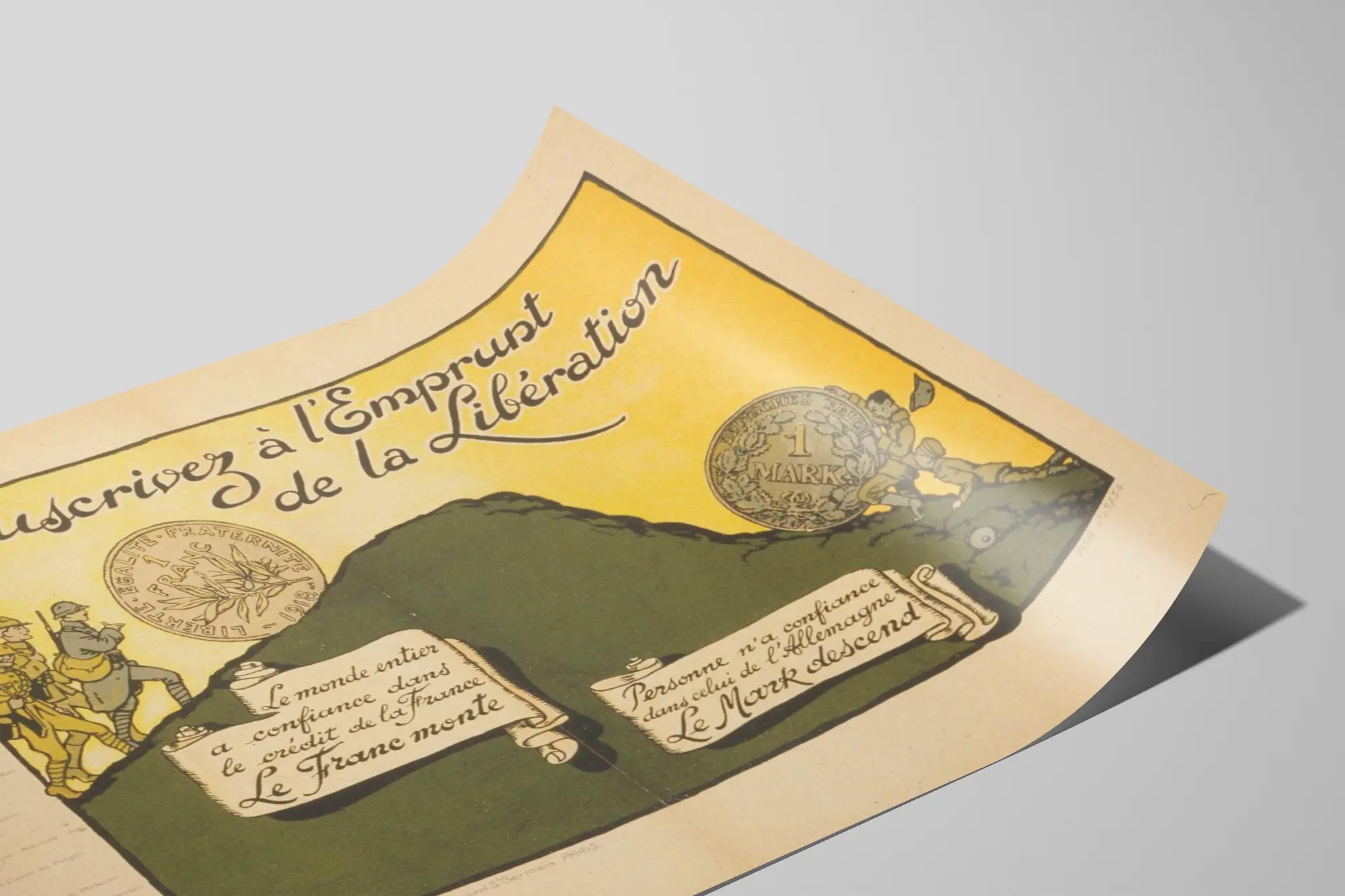 Dieses Vintage-Poster ist ein einzigartiges Stück historischer Wanddekoration, das einen Aufruf zur Zeichnung der Befreiungskreditaufnahme zeigt. Ideal für Geschichtsbegeisterte und Liebhaber authentischer Wanddekoration, präsentiert dieses Plakat ein grafisches Design mit starker Symbolik. Die dominierenden Farben sind Gelb und Grün, die eine warme, nostalgische Atmosphäre schaffen und jedem Raum einen Retro-Touch verleihen.