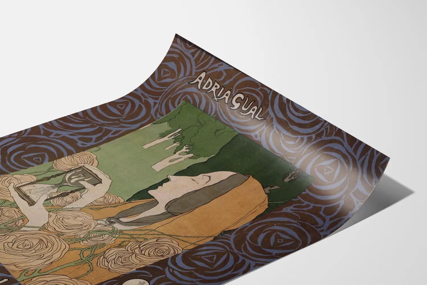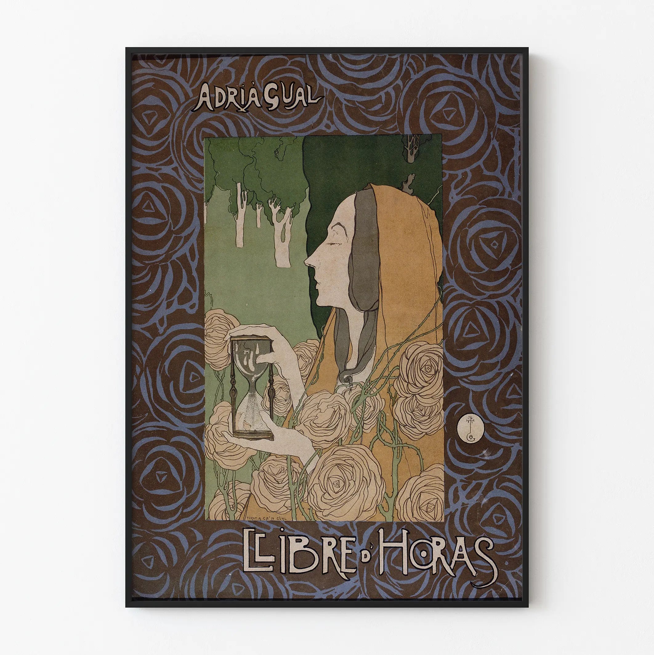 Dieses Wanddekorplakat mit dem Titel „Libre d'Horas“ ist ein ikonisches Werk im Jugendstil, signiert von Adrià Gual. Es zeigt eine zarte und elegante Komposition: eine weibliche Figur mit feinem Profil, gekleidet in einen ockerfarbenen Schleier und umgeben von stilisierten Rosen, hält eine Sanduhr, die auf subtile Weise die vergehende Zeit symbolisiert. Der grüne Hintergrund mit stilisierten Bäumen bietet einen beruhigenden Kontrast zu dem mit geschwungenen floralen Mustern verzierten Rahmen in Brauntönen und Blau, typische Merkmale des Jugendstils. Dieses dekorative Plakat ist ideal, um einem modernen oder klassischen Interieur eine künstlerische und raffinierte Note zu verleihen. Es eignet sich perfekt als Wandposter, Druck, um Wohn- oder Arbeitsräume zu verschönern, und bietet eine Balance zwischen floraler Ästhetik, zeitlicher Symbolik und weiblicher Eleganz. Sein sanftes Design mit geschwungenen Linien und seiner harmonischen Farbpalette fügt sich in eine Wanddekoration ein, die die Geschichte der Kunst und die Feinheit der Details hervorhebt. Es passt gleichermaßen in Wohnzimmer, Schlafzimmer oder Büro und schafft eine poetische und inspirierende Atmosphäre. Dieses dekorative Poster lädt zu ruhiger Betrachtung und Reflexion über die Zeit ein – eine zeitlose und universelle Wertschätzung, die es zu einem besonderen Stück für Kunstliebhaber und anspruchsvolle Wanddekoration macht.