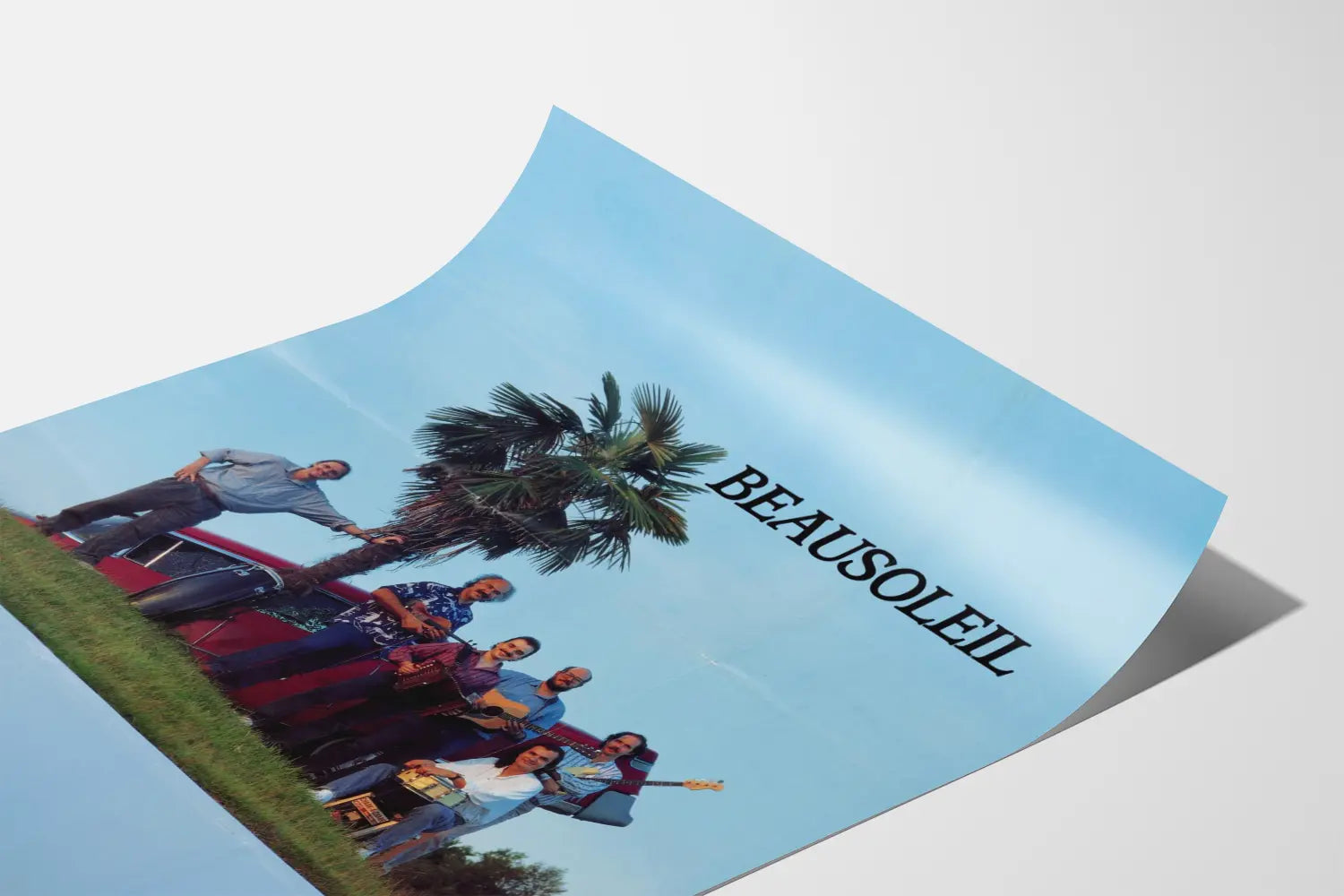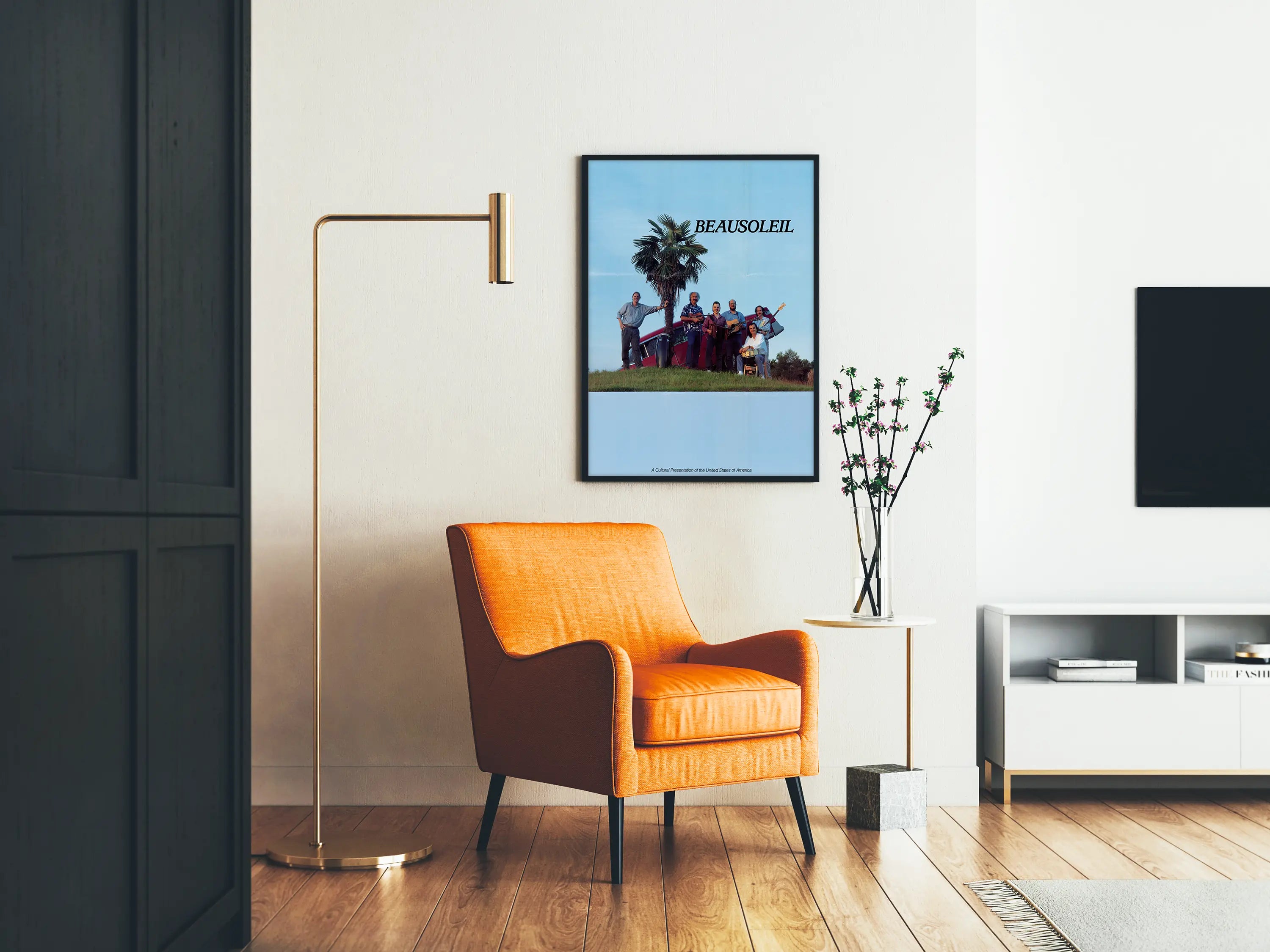 Bringen Sie einen einzigartigen Akzent in Ihre Wanddekoration mit diesem Poster, das die Musikgruppe Beausoleil zeigt. Auf einem hellblauen Himmelshintergrund illustriert dieses Poster sechs Musiker, die auf einem grünen Hügel posieren, neben einer Palme und einem umgestürzten alten roten Auto. Jedes Mitglied hält ein Instrument: Geige, Akkordeon, Akustikgitarre, E-Bass, Congas und Schlagzeug, was die musikalische Vielfalt der Gruppe unterstreicht. Diese kreative und farbenfrohe Komposition vermittelt eine festliche und gesellige Stimmung, ideal für Liebhaber traditioneller und volkstümlicher Musik. Ob im Wohnzimmer, Büro oder Musikraum – dieses Poster beeindruckt durch seine Originalität und seine warme Atmosphäre. Die Aufschrift „BEAUSOLEIL“ in schwarzen Großbuchstaben zieht den Blick auf sich, ohne das Bild zu überladen, während der dezente Text „A Cultural Presentation of the United States of America“ am unteren Rand die geschätzte kulturelle Herkunft betont. Diese Wanddekoration ist perfekt für Musikliebhaber, Sammler von Vintage-Postern oder jeden, der seinem Zuhause ein künstlerisches und lebendiges Element hinzufügen möchte. Das vertikale Format und die sanften Farben passen sich mühelos verschiedenen Einrichtungsstilen an, vom modernsten bis zum klassischsten. Bringen Sie positive Energie und kulturelle Vielfalt in Ihren Raum mit diesem inspirierenden und ästhetischen Wandbild. Gönnen Sie sich einen Hauch von Authentizität und guter Laune mit diesem künstlerischen Poster, das den Charme einer legendären Gruppe durch eine einfache, aber charaktervolle Szene hervorhebt.