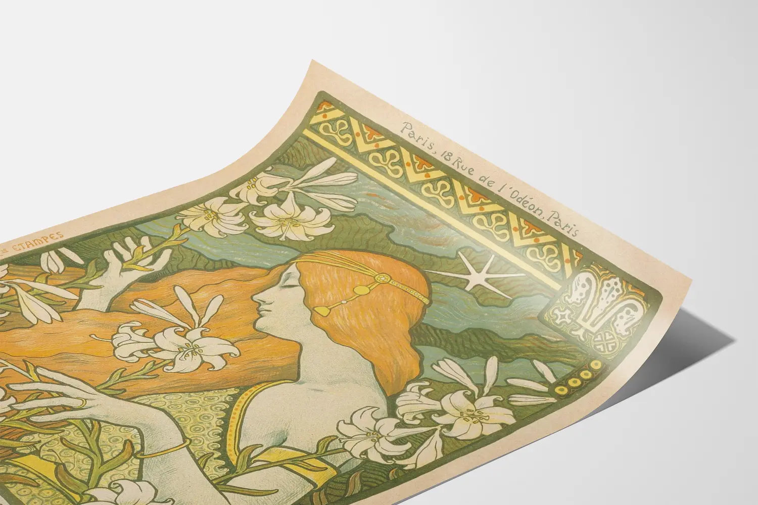 Dieses Wandbild ist auch eine schöne Geschenkidee für Kunstliebhaber und Design-Geschichtsfans, da es eine bedeutende Epoche in der Entwicklung der Dekoration und der Werbeplakate illustriert. Die Details wie die Inschrift „Paris, 18 Rue de l’Odéon“ und die Signatur des Druckers Camille Ginard & Cie Étampes verleihen diesem Druck zudem einen authentischen Charme und spiegeln das handwerkliche Können vergangener Zeiten wider.