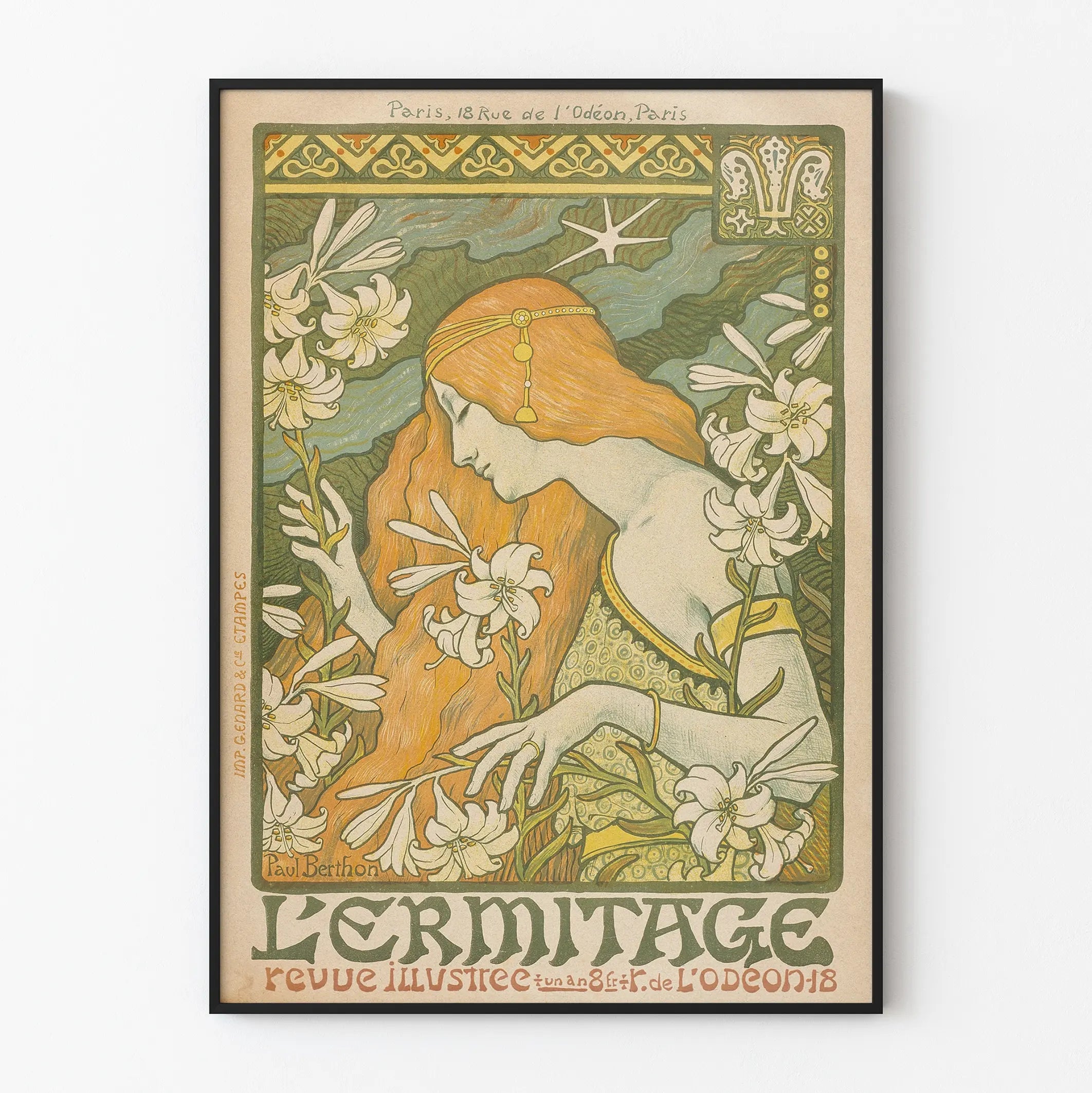 Entdecken Sie dieses wunderschöne Jugendstil-Poster mit dem Titel „L'Ermitage“, signiert vom Künstler Paul Berthon. Dieses Plakat zeigt eine Frau mit langen, gewellten roten Haaren, umgeben von zahlreichen weißen Lilien, die zart detailliert sind. Dieses Werk vermittelt eine ruhige und harmonische Atmosphäre, perfekt, um jeden Raum für Wanddekoration zu bereichern.