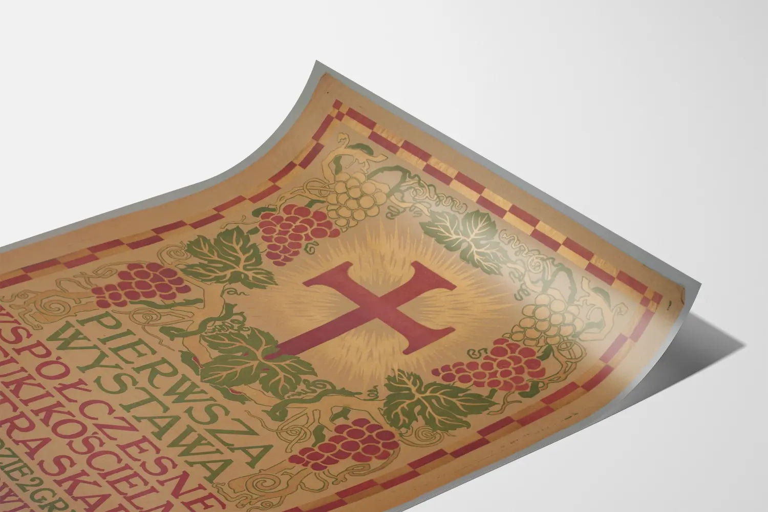 Dieses alte und dekorative Plakat würdigt die erste Ausstellung zeitgenössischer religiöser Kunst, die 1911 in Krakau dem Künstler Piotr Skarga gewidmet war. Es stellt ein einzigartiges Wanddekorationselement dar, das religiöse Motive mit stilisierten künstlerischen Elementen verbindet. Die Zeichnung zeigt ein zentrales Kreuz, umgeben von einem leuchtenden Heiligenschein, der das göttliche Licht symbolisiert. Um das Kreuz herum schmücken Trauben und Weinblätter das Plakat und erinnern an die traditionellen Themen der Eucharistie und des christlichen Symbols des Weins. Der Text ist nahtlos in das Design integriert, mit markanten, farbigen Zeichen in Grün und Bordeaux, die die Bedeutung des Ereignisses und seinen historischen Ort, den Kunstpalast in Krakau, hervorheben. Der Rahmen des Plakats wird durch ein rot-goldenes Schachbrettmuster akzentuiert, das dem Gesamtbild Eleganz und visuelles Gleichgewicht verleiht. Dieses Plakat besticht durch seinen grafischen Stil, der von pflanzlichen Ornamenten geprägt ist und charakteristisch für die frühen religiösen Künste des 20. Jahrhunderts ist. Es schafft eine Brücke zwischen Tradition und Moderne. Es kann als authentisches Dekorationsposter für Liebhaber sakraler Kunst, religiöser Geschichte oder Vintage-Wanddekoration verwendet werden. Dieses Poster ist auch eine schöne Idee, um einen Raum mit einem Stück zu bereichern, das sowohl spirituell als auch ästhetisch ist – perfekt für eine Bibliothek, ein Büro oder ein Wohnzimmer. In der Sammlung der Wanddekorationen ist dieses Ausstellungsposter ideal für Kunst- und Religionskulturbegeisterte. Sein symbolisches Design, kombiniert mit sorgfältiger Typografie, macht es zu einem Schlüsselelement für eine Dekoration, die die christliche Tradition und das historische künstlerische Erbe widerspiegelt. Dieses Bild zeigt auch die grafische Übung der Epoche mit einer Palette aus dezenten, aber eindrucksvollen Farben, die Kontraste zwischen Grün, Bordeaux und goldenen Nuancen nutzen. Kurz gesagt, ist dieses zeitgenössische religiöse Kunst-Ausstellungsposter ein echtes Stück Geschichte und Ästhetik. Es bietet eine bedeutungsvolle Wanddekoration, die einen Raum verwandeln kann, indem sie eine Note von Spiritualität und künstlerischer Eleganz des frühen 20. Jahrhunderts hinzufügt.