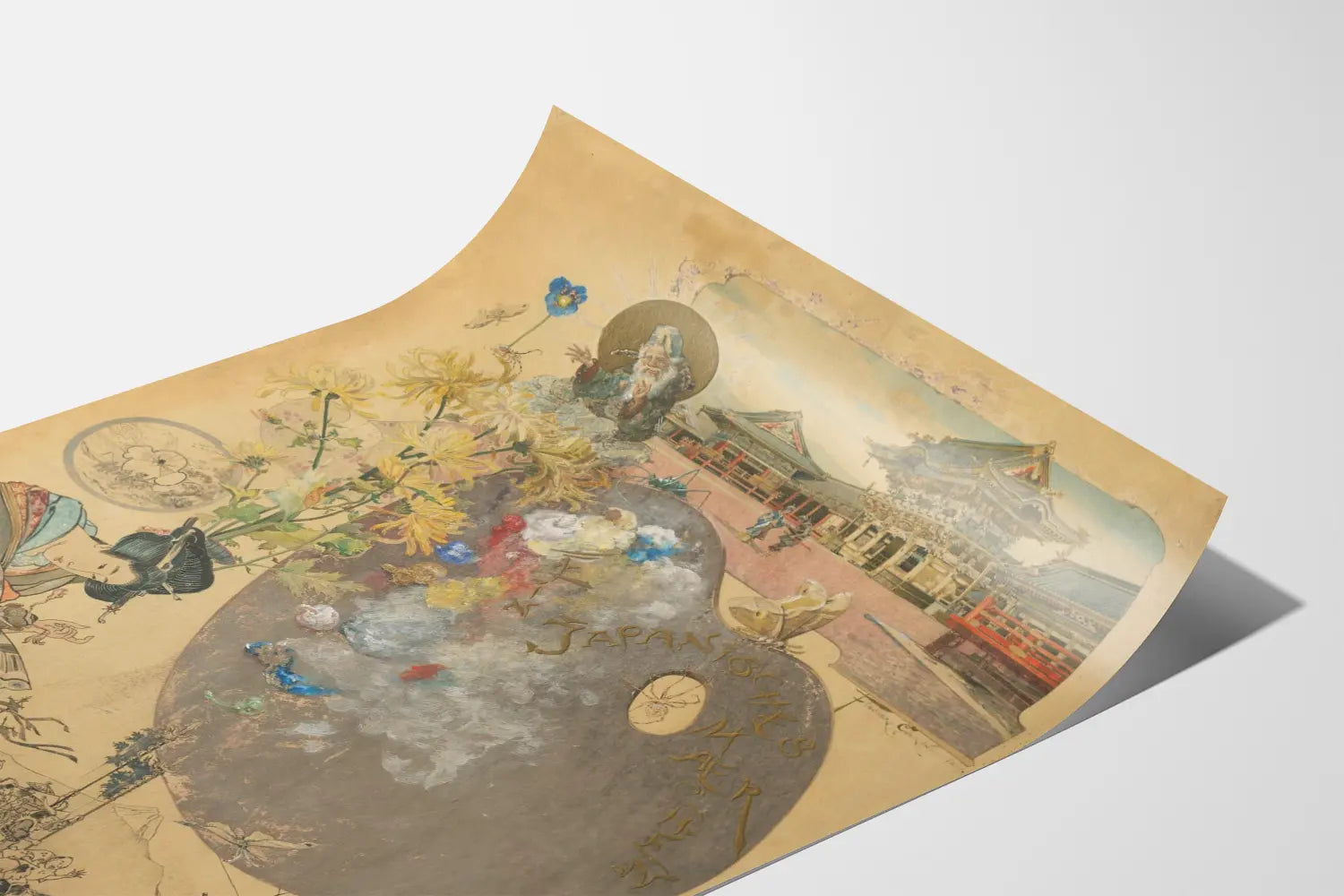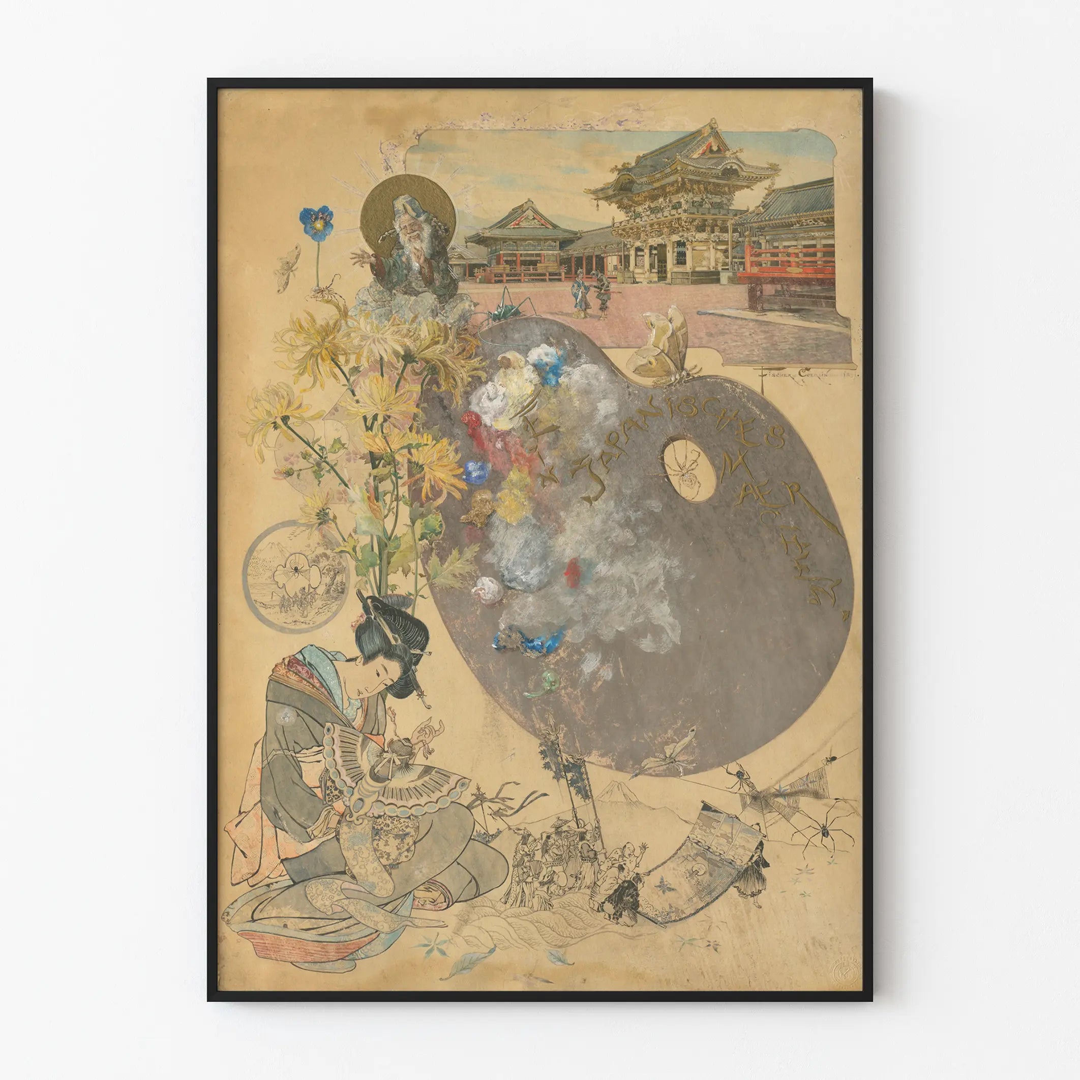 Dieses künstlerische Vintage-Poster zeigt eine Szene, inspiriert vom japanischen Volksglauben, mit einer reichhaltigen Palette an traditionellen und symbolischen Details. Durch diese Wanddekoration entdeckt man eine harmonische Verbindung zwischen einer stilisierten Darstellung einer sitzenden Geisha, umgeben von natürlichen Elementen wie zarten gelben Blumen und einem Schmetterling, sowie einer Malerpalette, geschmückt mit Aquarellfarben in verschiedenen Tönen. Auf dieser Palette steht der Text „Japanisches Märchen“, der das Thema der japanischen Geschichten aufgreift. Im Hintergrund offenbart das Poster eine detaillierte, farbenfrohe japanische Architektur, die das kulturelle und historische Erbe Japans widerspiegelt. Fein gearbeitete Motive, wie kleine menschliche Figuren, eine Spinne und Insekten, verleihen diesem einzigartigen Poster eine erzählerische Dimension. Dieses Wandbild besticht durch seine filigrane Gestaltung, verbunden mit einer antiken Patina, die eine nostalgische und authentische Atmosphäre schafft. Perfekt für Liebhaber von Wanddekorationen, inspiriert von Kunst und Kultur des Orients, verleiht dieses Poster jedem Raum eine exotische und elegante Note. Dieses dekorative Werk, durch seinen Stil und seine Motive, passt ideal in eine Zen- oder Kunst-Atmosphäre und schafft ein harmonisches Gleichgewicht zwischen Tradition und Kreativität. Mit diesem Wandposter in Ihrem Raum bringen Sie die japanische Ästhetik in Ihre Dekoration und setzen einen kulturellen sowie künstlerischen Akzent. Ob im Wohnzimmer, Büro oder Schlafzimmer – dieses Vintage-Poster mit japanischem Thema verleiht Ihrer Wandgestaltung einen originellen und raffinierten Charakter.