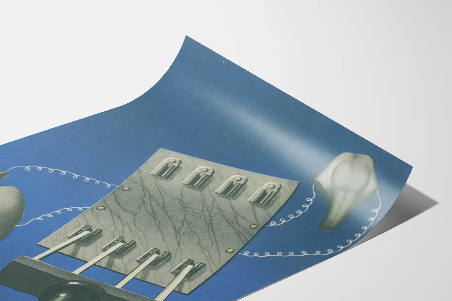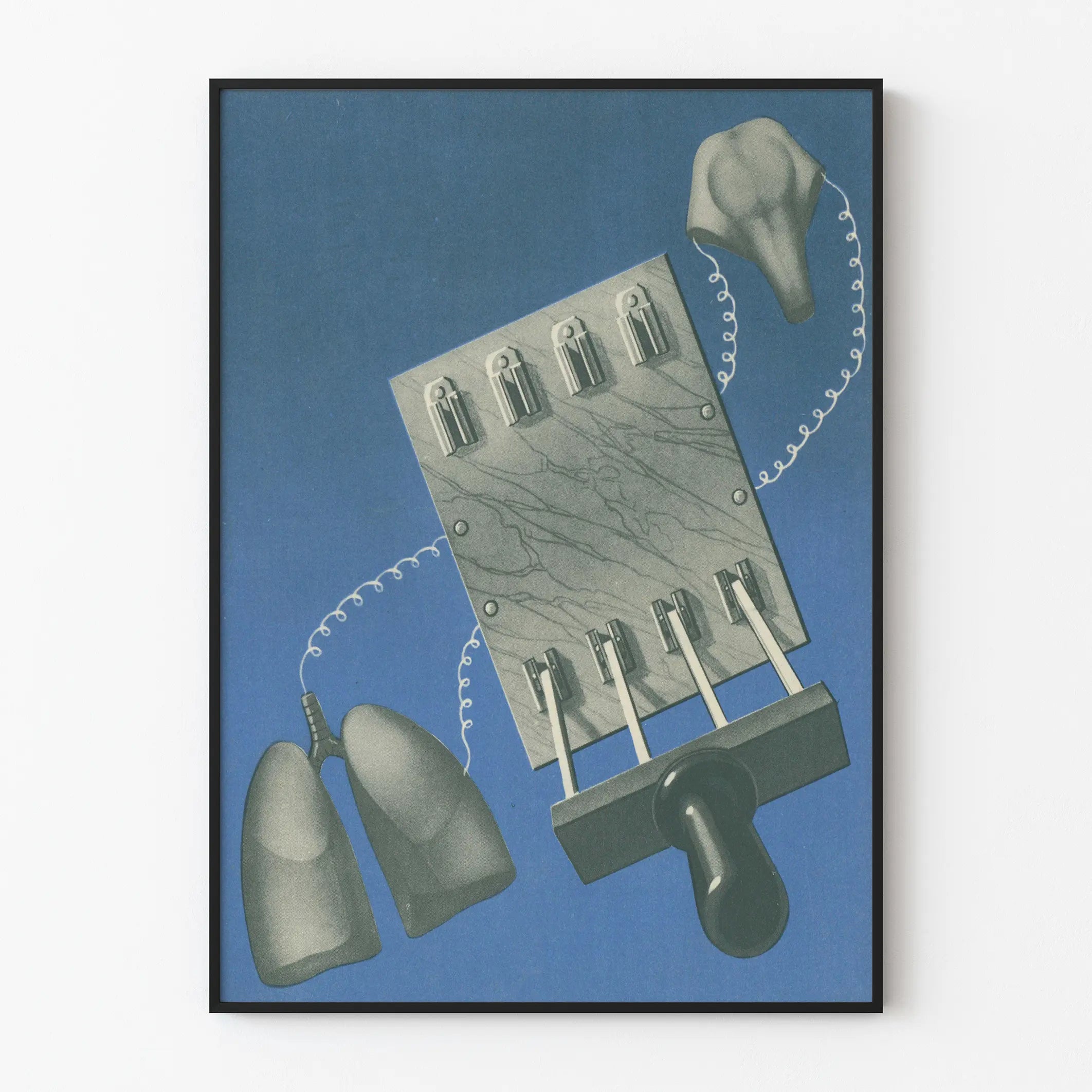 Dieses künstlerische Plakat bietet eine abstrakte und surrealistische Sichtweise, die mechanische und organische Elemente miteinander verbindet und eine einzigartige sowie faszinierende Wanddekoration schafft. Auf einem einfarbigen blauen Hintergrund vereint eine grafische Montage Formen, die an menschliche Organe wie Lungen oder ein stilisiertes Herz erinnern, verbunden durch weiße, gedrehte Fäden, die zu einem zentralen mechanischen Element führen, das an eine alte Hebelvorrichtung erinnert. Diese Mischung aus biomorphischen und technischen Formen ergibt eine visuelle Darstellung, die sowohl retro als auch futuristisch wirkt – ideal für ein modernes Interieur oder einen kreativen Arbeitsraum. Dieses Wandstück ist perfekt für Liebhaber grafischer Kunst und origineller visueller Entdeckungen, die einen Hauch von Modernität und einen faszinierenden Blickfang für die Dekoration eines Wohnzimmers, Büros oder Studios bieten. Erhältlich als Plakat oder Poster, ermöglicht dieses Wanddekorationselement eine einfache Anbringung und eine hochwertige Darstellung, die die Nuancen von Grau auf dem tiefblauen Hintergrund hervorhebt. Diese Komposition überträgt elegant die Idee organischer Mechanik und ist ideal, um eine Wand mit künstlerischem oder thematischem Ausdruck zu bereichern, wobei ein Gleichgewicht zwischen Abstraktion und symbolischer Darstellung geschaffen wird. Perfekt für diejenigen, die eine innovative und ungewöhnliche Wanddekoration suchen, unterstreicht dieses bemerkenswerte Plakat die Verbindung zwischen Technologie und Natur durch eine sorgfältige Ästhetik und eine harmonische Komposition.