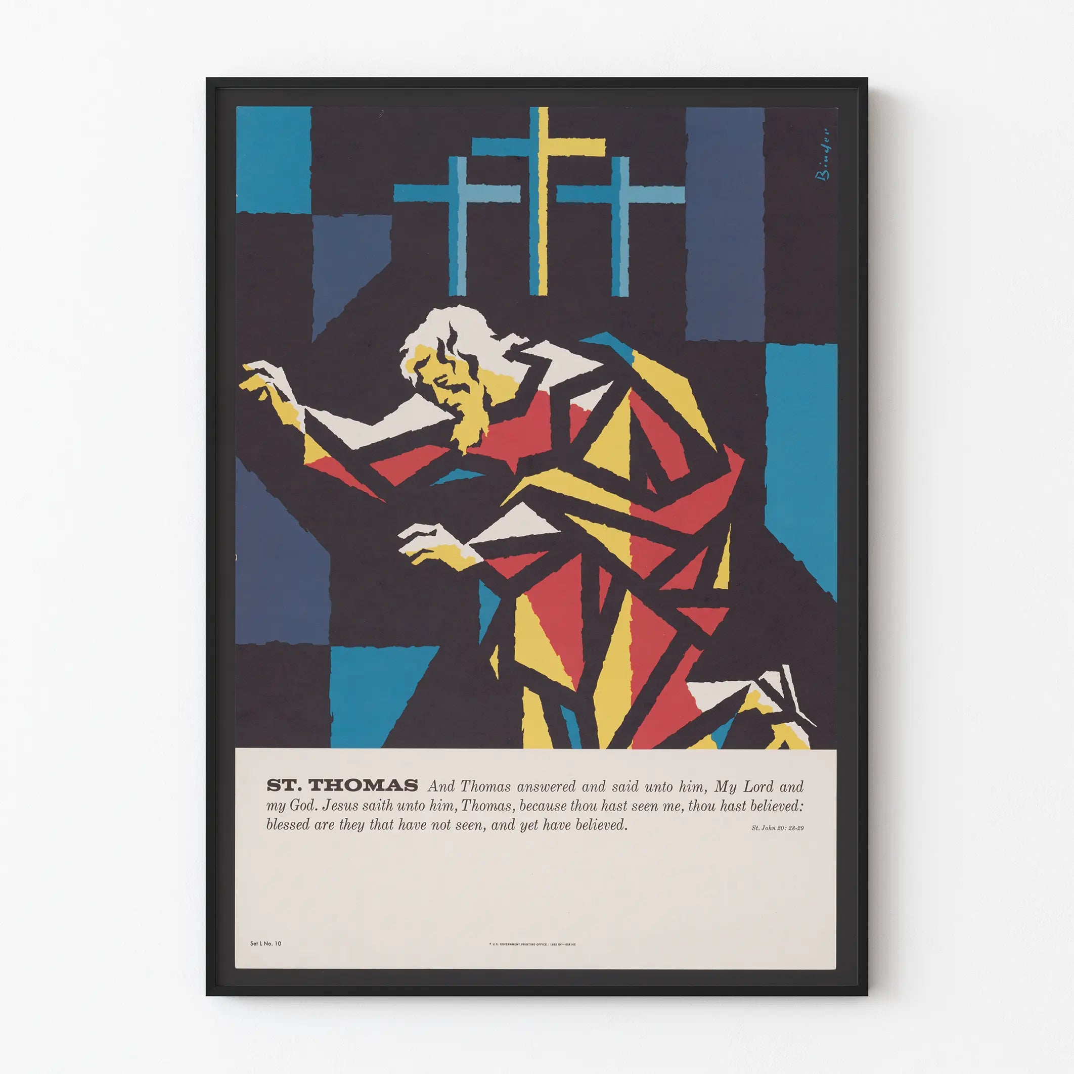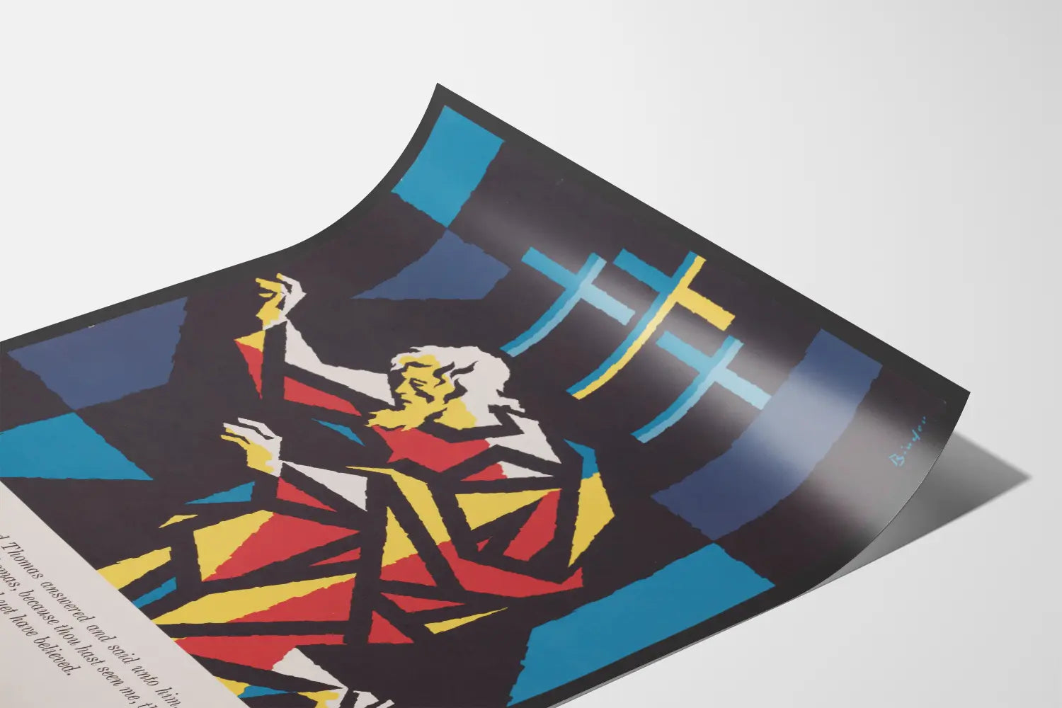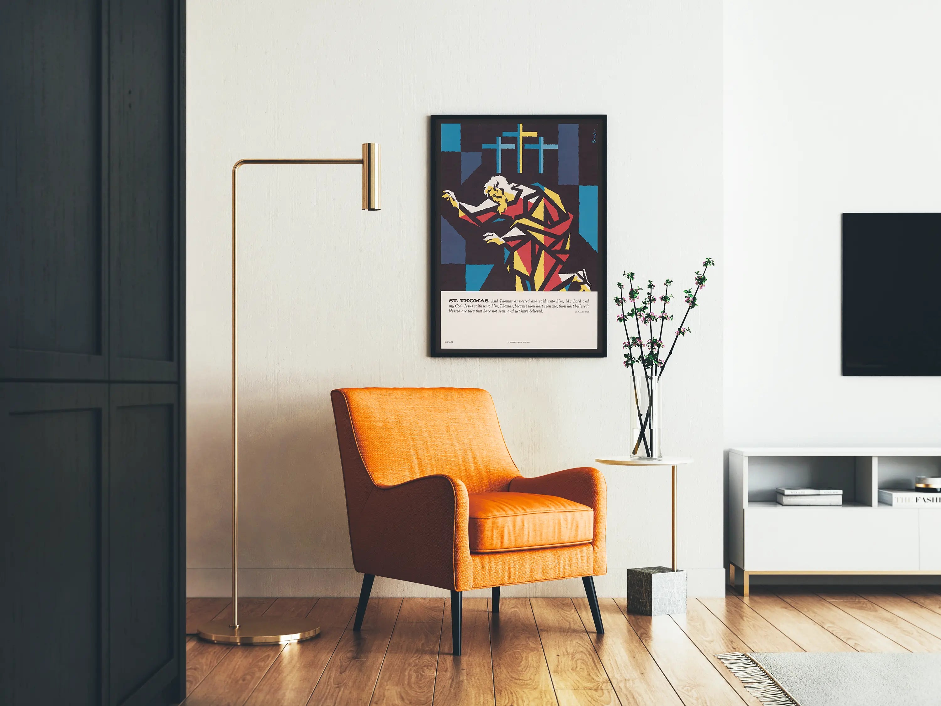 Dieses Poster von St. Thomas ist ein einzigartiges Wanddekorationselement, das einen markanten geometrischen Stil mit einer kraftvollen symbolischen Darstellung verbindet. Das Plakat zeigt die Figur des Heiligen Thomas in einer Anbetungshaltung, bestehend aus scharfen Formen in lebendigen Farben wie Rot, Gelb, Blau und Weiß, die sich von einem dunklen Hintergrund abheben. Diese Komposition erzeugt einen dynamischen und zeitgenössischen visuellen Effekt, der perfekt ist, um jedem Raum eine künstlerische und spirituelle Note zu verleihen. Über der Silhouette dominieren drei stilisierte Kreuze die Szene und verleihen dem Wandbild eine heilige und symbolische Dimension. Ein biblisches Zitat aus dem Johannesevangelium (20:28-29), am unteren Rand des Posters gedruckt, ergänzt die Botschaft des Glaubens, die das Bild vermittelt: „Thomas antwortete und sprach zu ihm: Mein Herr und mein Gott! Jesus spricht zu ihm: Weil du mich gesehen hast, glaubst du. Selig sind, die nicht sehen und doch glauben.“ Dieses Wanddekor ist ideal für alle, die eine moderne religiöse Ikonographie in ihr Zuhause integrieren möchten, sei es im Wohnzimmer, Schlafzimmer oder Meditationsraum. Dank seiner abstrakten Formen und ausdrucksstarken Farben übertrifft dieses Poster eine einfache Illustration und wird zu einem echten dekorativen Element, das jede Wand lebendig macht. Es ist besonders geeignet für Liebhaber moderner Poster mit starker Symbolik, die grafische Kunst und Spiritualität verbinden. Für eine schlichte und elegante Dekoration sorgt dieses St. Thomas-Poster für eine kontemplative und tiefgründige Atmosphäre, perfekt für eine intime Stimmung oder eine Gebetsnische. Zusammenfassend ist dieses Poster eine Wanddekoration, die moderne Optik mit einer Botschaft des Glaubens verbindet – ideal, um Ihr Zuhause kunstvoll und spirituell zu bereichern.