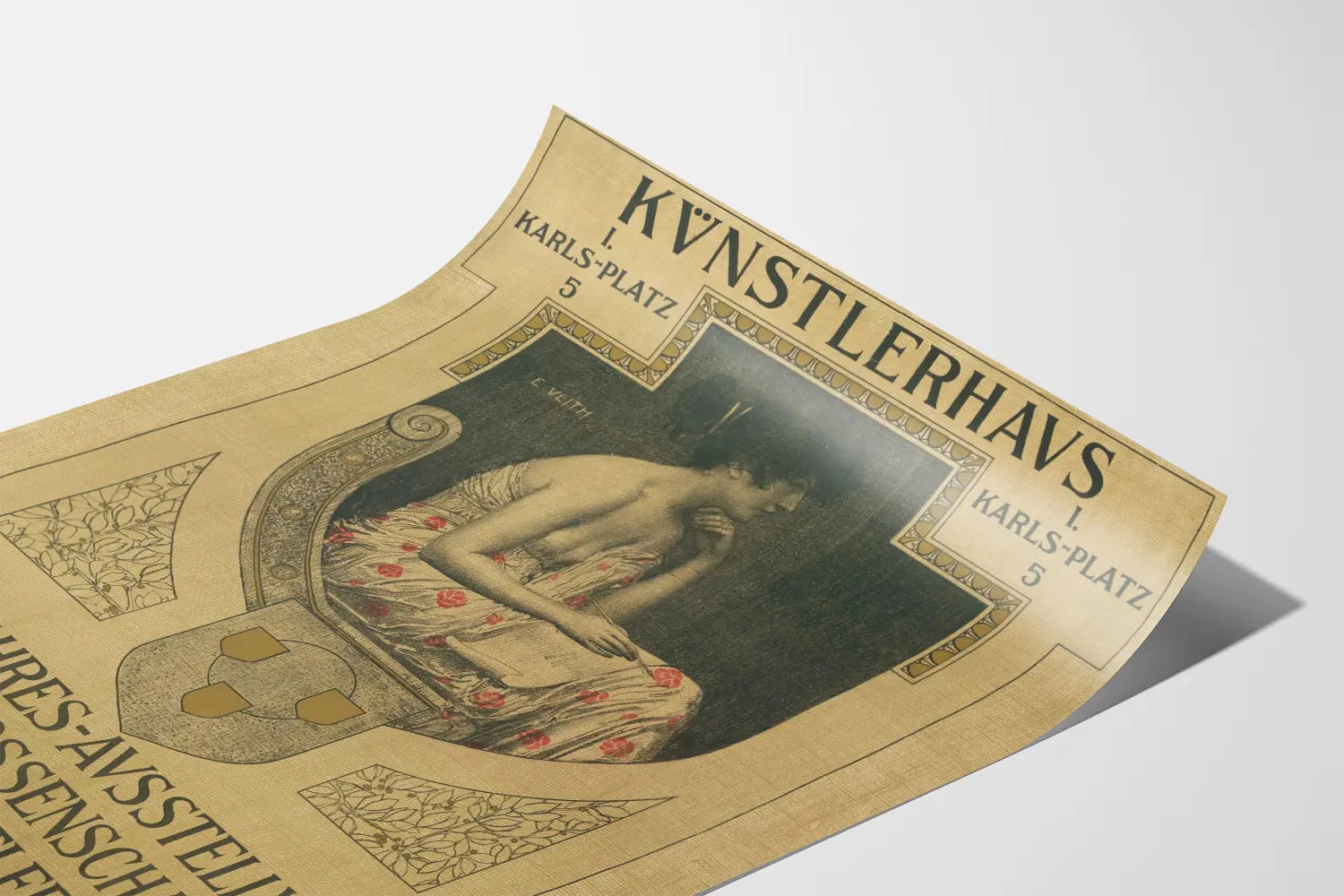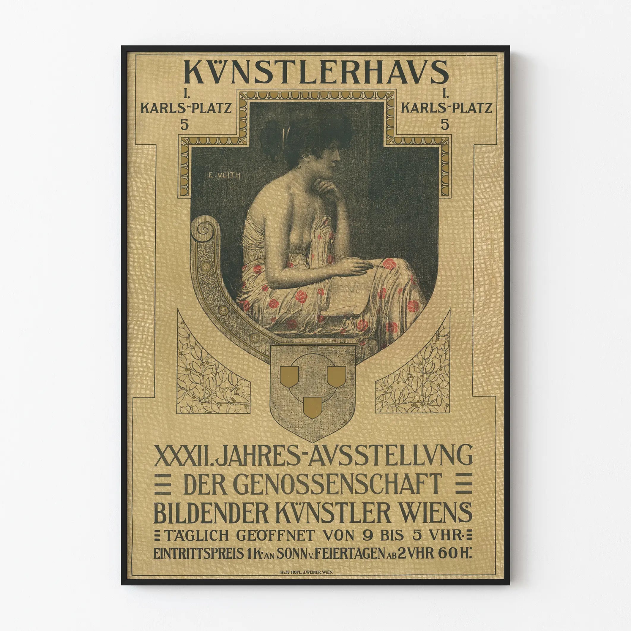 Dieses Vintage-Poster ist eine elegante und künstlerische Darstellung einer jährlichen Ausstellung von Wiener Bildkünstlern, präsentiert im Kunstlerhaus, gelegen am Karlsplatz 5. Dieses Plakat ist ein bemerkenswertes Beispiel für Wanddekoration, perfekt für Kunstliebhaber und Liebhaber historischer Gestaltung. Die zentrale Illustration zeigt eine weibliche Figur im Profil, sitzend und gekleidet in ein Kleid mit roten Blumenmustern auf hellem Hintergrund, was einen subtilen, aber charmanten Kontrast zur dunklen Tonalität des Hintergrunds bietet. Dieses Poster zeichnet sich durch seinen sowohl klassischen als auch raffinierten grafischen Stil aus, mit einer geometrischen Komposition, die die Hauptszene umrahmt, insbesondere mit einem Wappen und dekorativen Blumenmotiven. Im typografischen Bereich enthält der deutsche Text wichtige Informationen über die Ausstellung, wie den Ort, die täglichen Öffnungszeiten und die spezifischen Eintrittspreise für Sonntage und Feiertage. Dieses Plakat beschränkt sich nicht nur auf eine einfache Veranstaltungsankündigung, sondern verkörpert auch ein dekoratives Kunstwerk, das sich perfekt in jeden Innenraum einfügt, der eine künstlerische und vintage Atmosphäre sucht. Es kann als gerahmtes Poster oder Wandbild verwendet werden und trägt dazu bei, die Wanddekoration mit einem Hauch von Geschichte und Eleganz zu bereichern. Diese Art der Wanddekoration ist ideal für kulturelle Räume, Kunststudios oder moderne Salons, die einen ausgeprägten Geschmack für klassische Ästhetik und Ausstellungsposter zeigen möchten. Insgesamt ist dieses Stück eine einzigartige Wahl für diejenigen, die ihre Leidenschaft für Kunst mit Liebe zum Detail in ihrer Inneneinrichtung verbinden möchten.