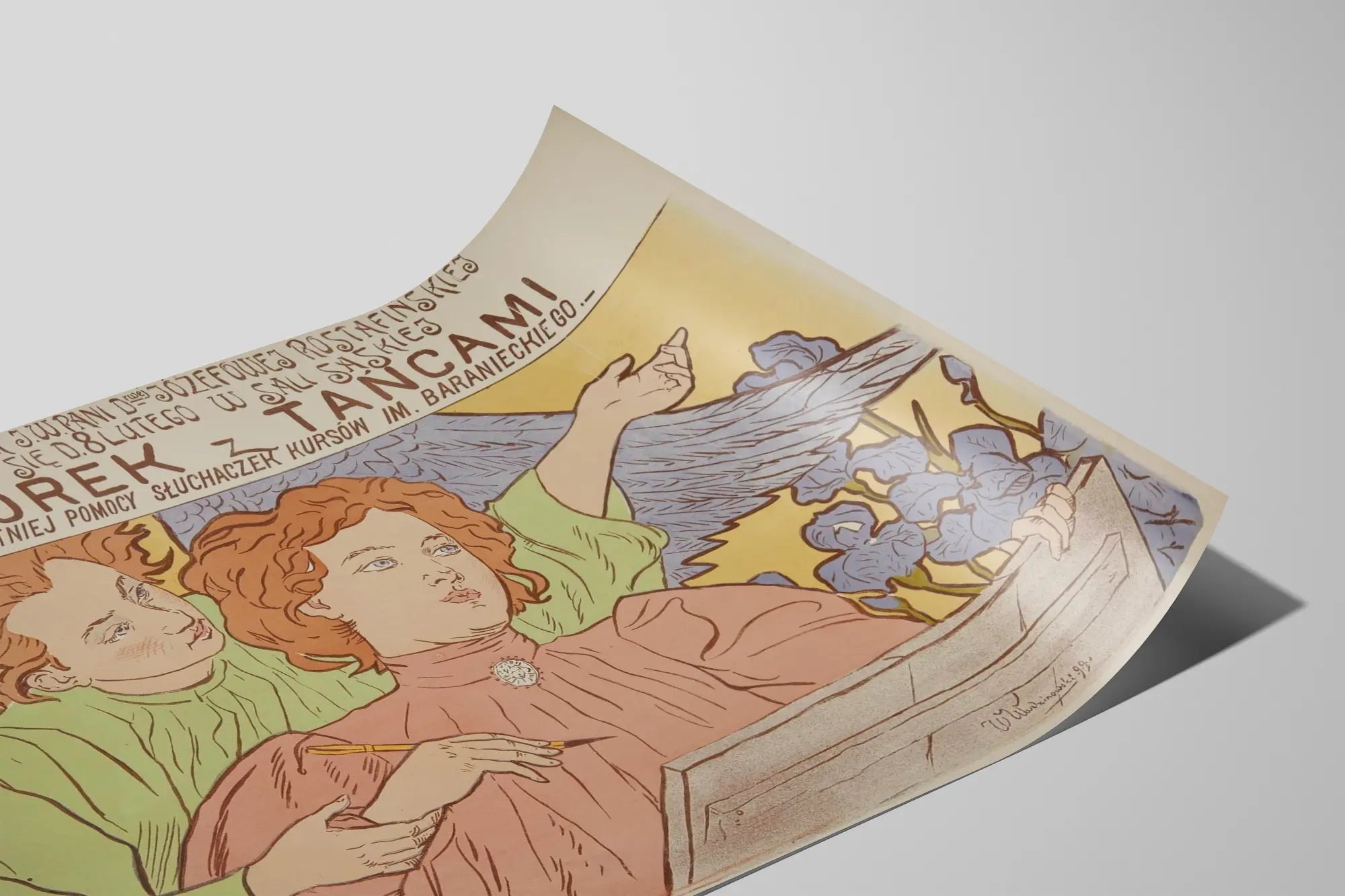 Bringen Sie mit diesem Vintage-Poster mit dem Titel "Wieczorek z Tańcami" einen Hauch von Eleganz und Originalität in Ihr Zuhause. Dieses Plakat zeigt eine harmonische künstlerische Komposition, die die Sanftheit pastellfarbener Töne mit ausdrucksstarken Details verbindet. Das Werk inszeniert zwei weibliche Figuren in einem präzisen und zarten grafischen Stil, der klare Konturen und subtile Farben wie Hellgrün, Rosa und Gelb hervorhebt und eine sanfte, beruhigende Atmosphäre schafft. Das stilisierte Erscheinungsbild der Figuren, kombiniert mit floralen Elementen und ausgebreiteten Flügeln, verleiht diesem Wanddekorationselement ein Gefühl von Bewegung und Poesie. Geeignet für Wohnräume, Büros oder Kreativbereiche, ist dieses Poster ideal für Kunst- und Designliebhaber, die ein dekoratives Element suchen, das sowohl anspruchsvoll als auch visuell reich an Geschichte ist. Als Wandbild verleiht es Tiefe und Charakter, wobei es einen Vintage-Stil bewahrt, der perfekt zu klassischem oder eklektischem Mobiliar passt. Dieses Poster ist auch eine ausgezeichnete Wahl, um einen Raum für Kultur, Grafikdesign oder Literatur zu personalisieren, dank seiner inspirierenden visuellen Wirkung und seinem typografischen Charme. Integrieren Sie dieses künstlerische Plakat in Ihre Wanddekoration, um Ihre Wände mit einem einzigartigen kulturellen und ästhetischen Akzent zu bereichern.